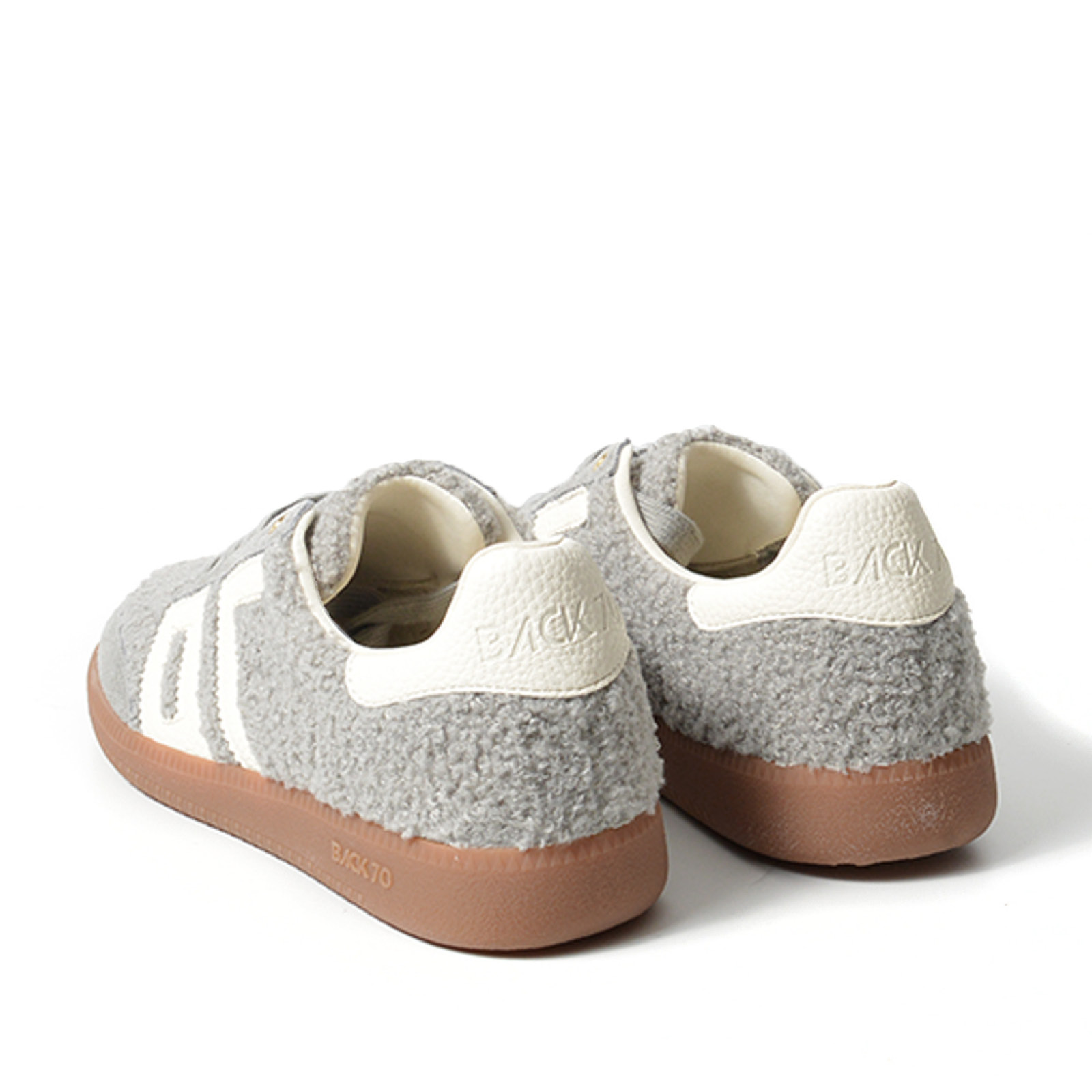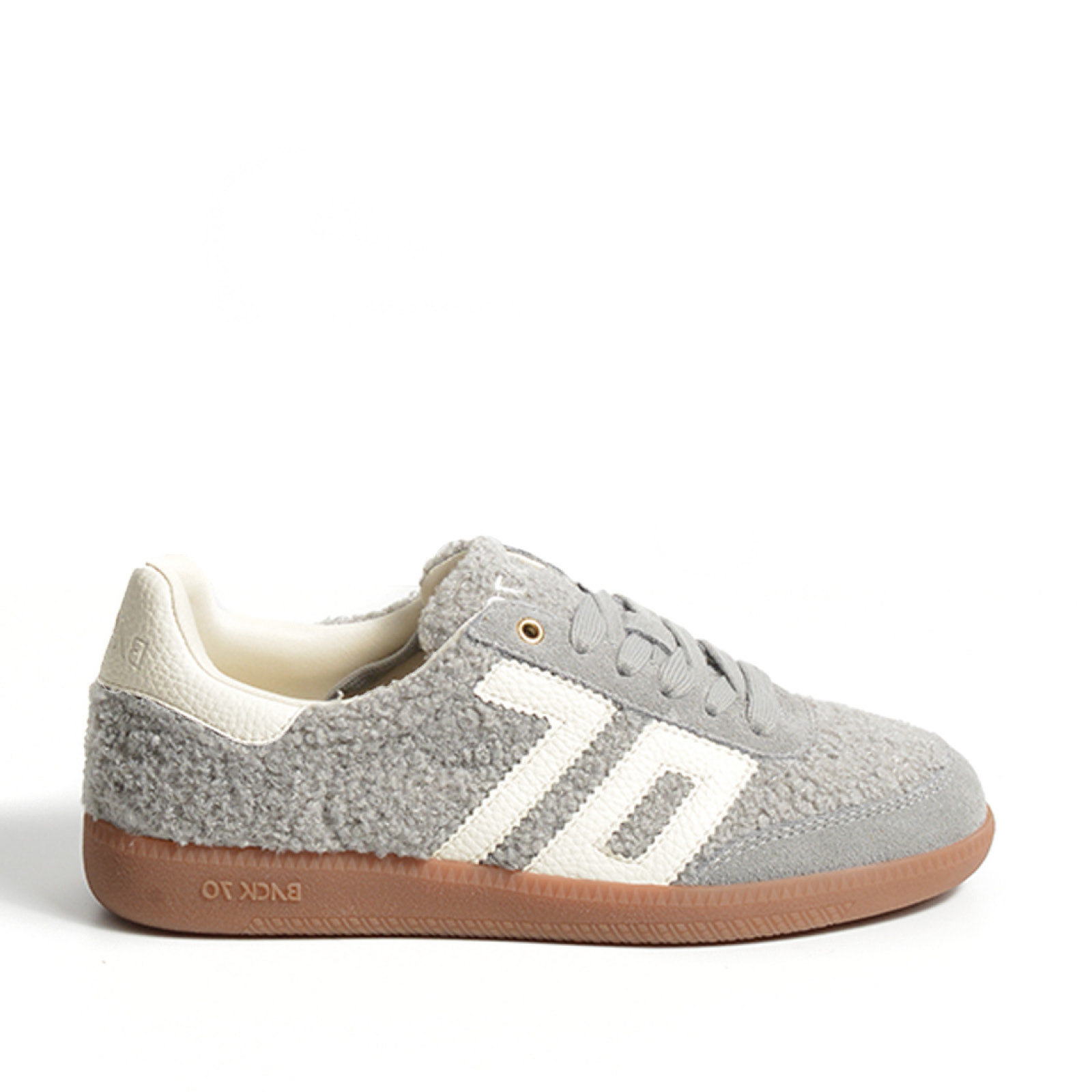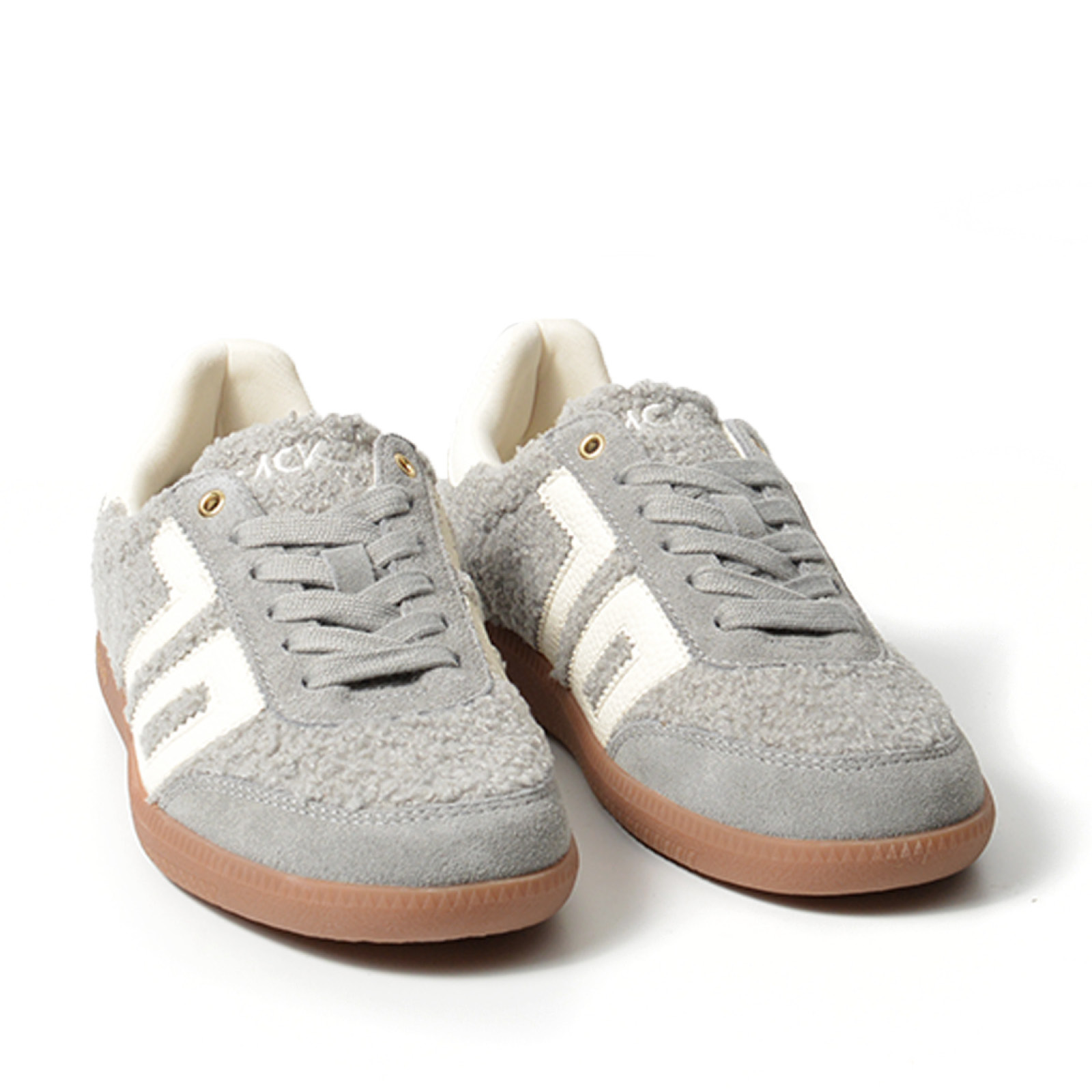 - Sneaker in suede grigio perla e ricciolino con logo in pelle bianca.