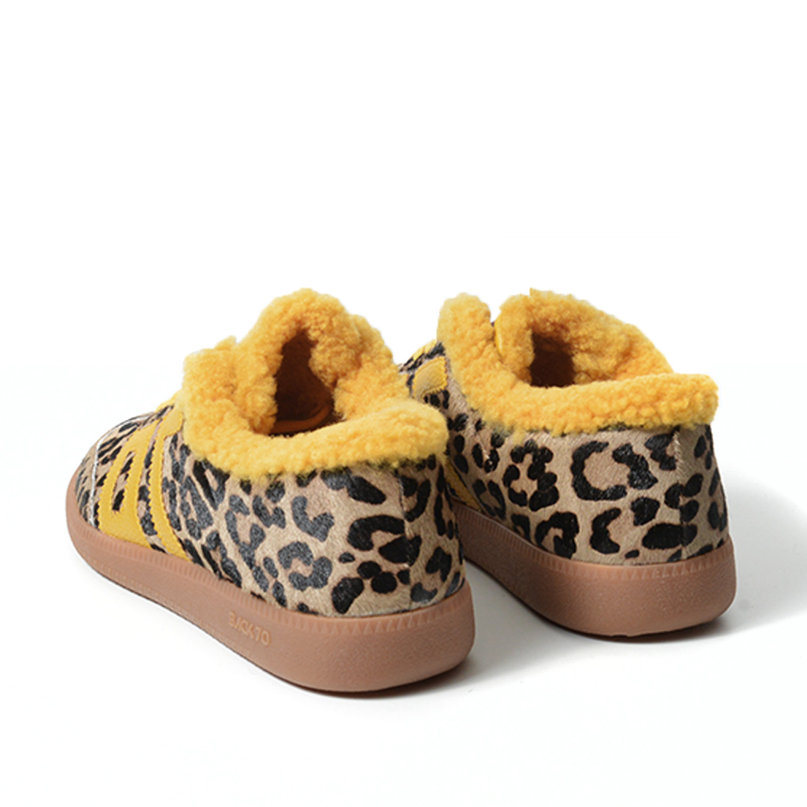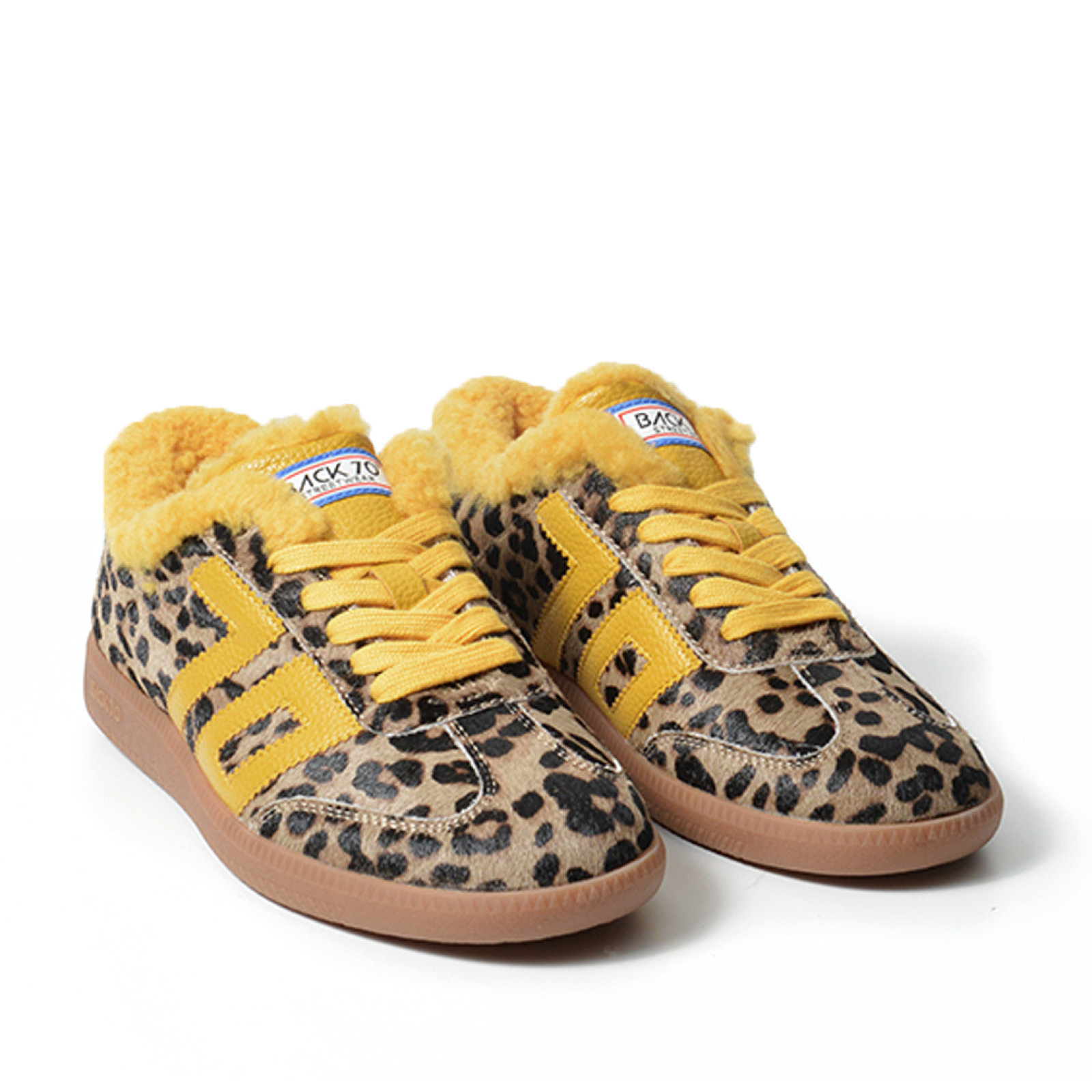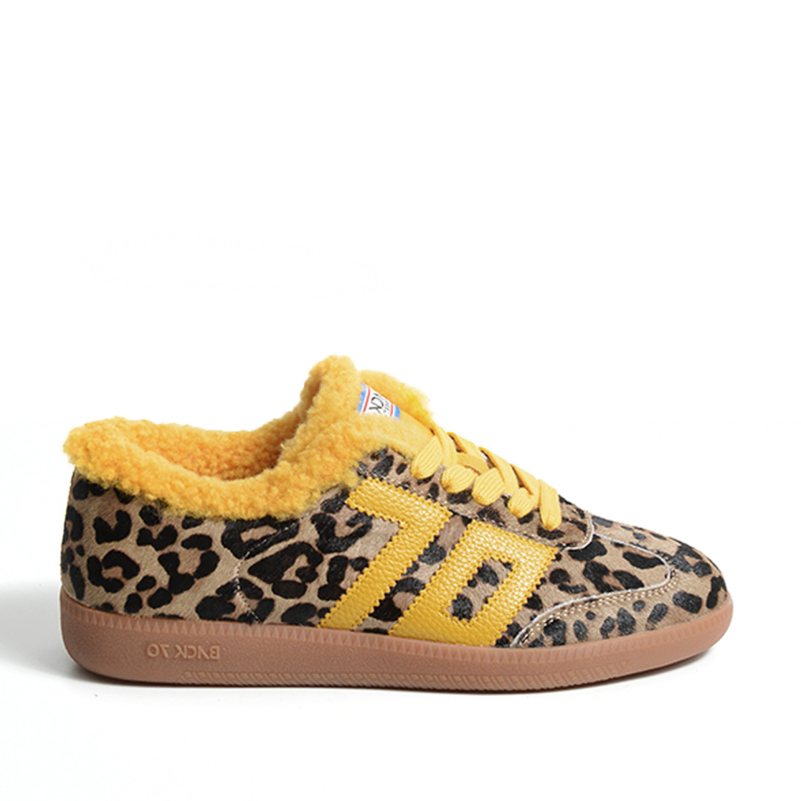 - Sneaker in cavallino maculato beige e marrone con logo in pelle gialla coordinato con il tessuto orsetto sul bordo e sulla linguella.