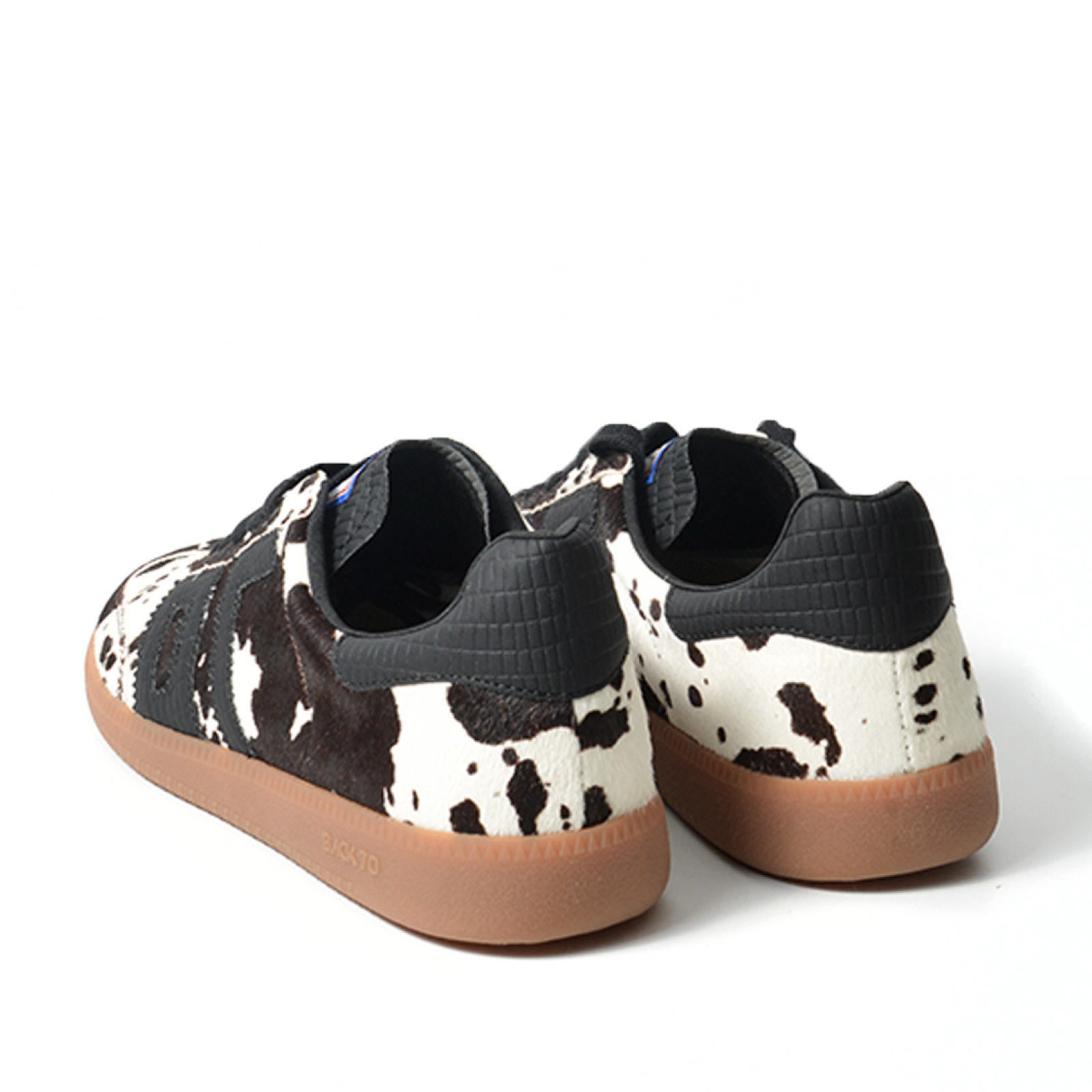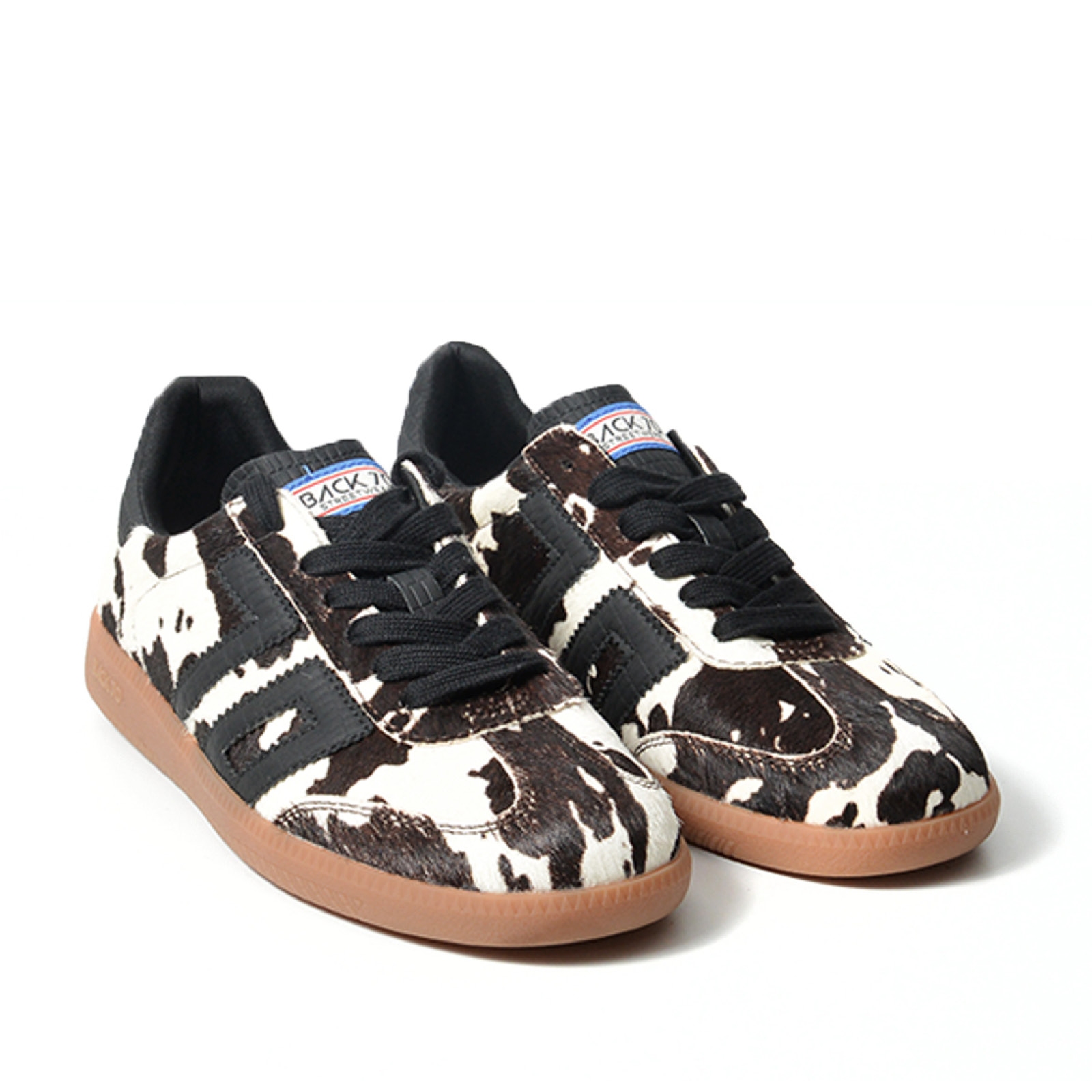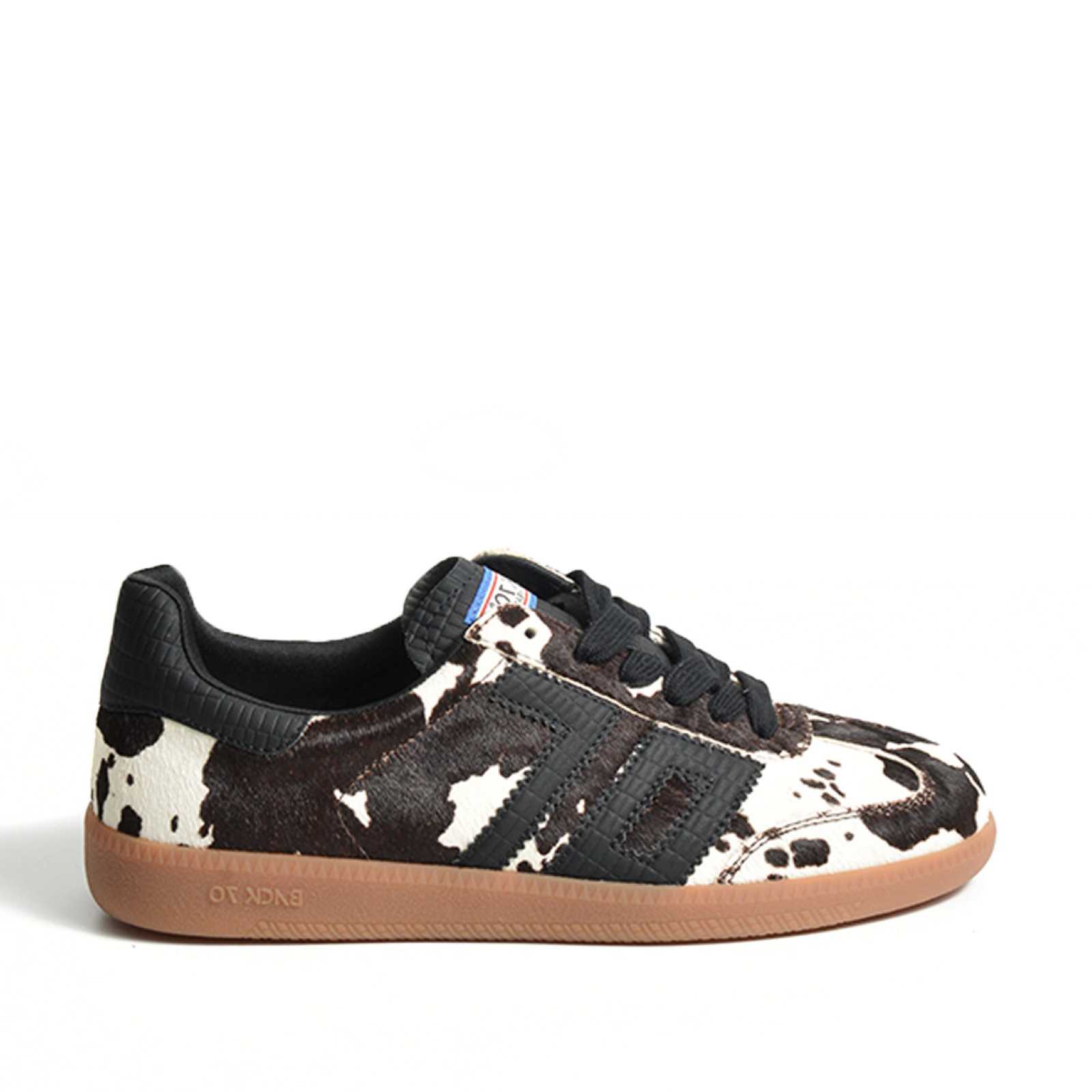 - Sneaker in cavallino stampa mucca bianco marrone e nera con logo in pelle nera.