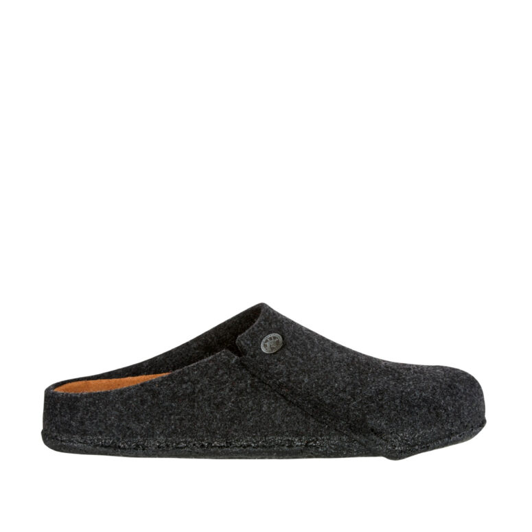 - Pantofola Birkenstock modello Zermat in feltro di lana grigio scuro con plantare estraibile.
