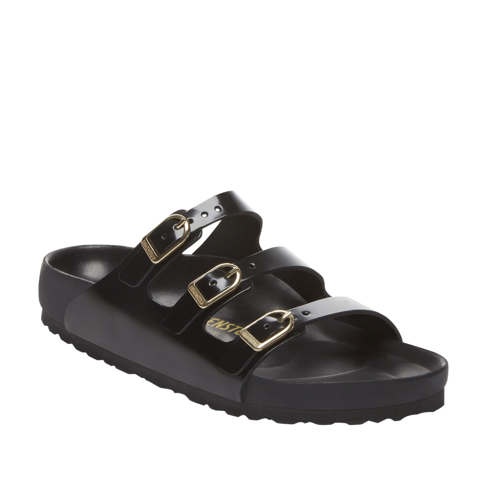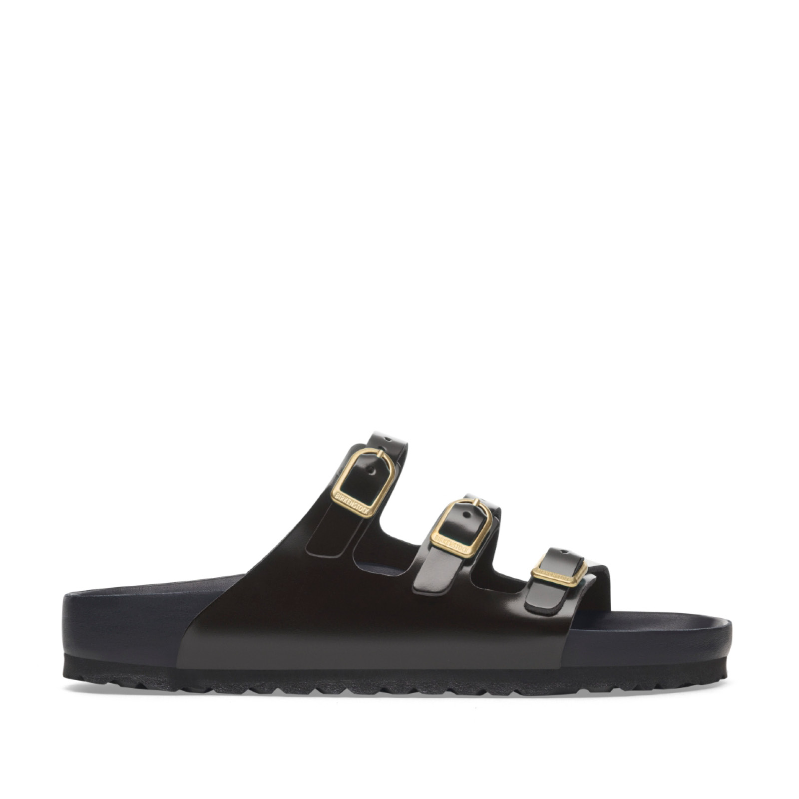 - Sandalo Birkenstock modello Florida con tre cinturini regolabili in pelle spazzolata nera e fibbie oro.