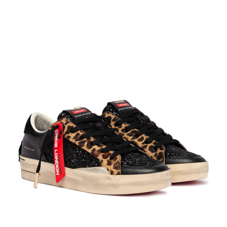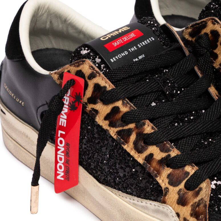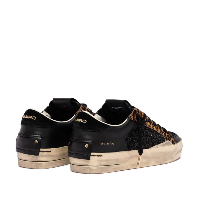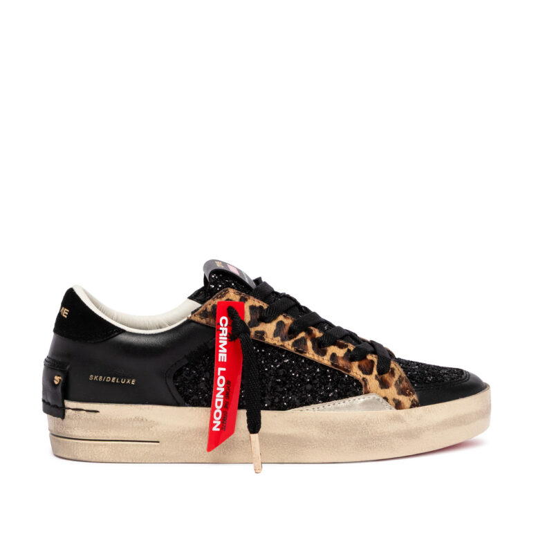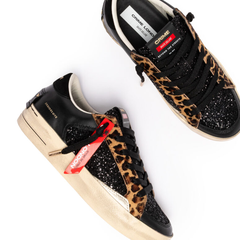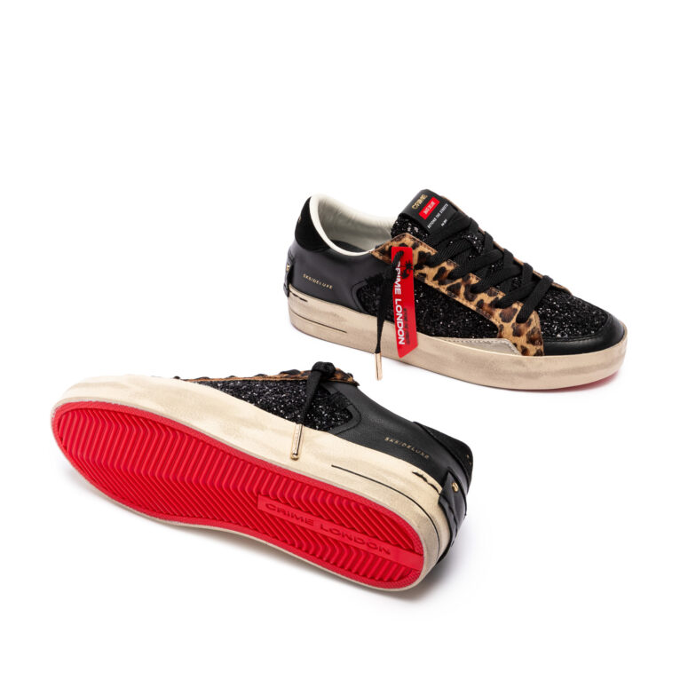 - Sneaker Crime London donna modello SK8 Deluxe in morbida pelle nera e glitter.