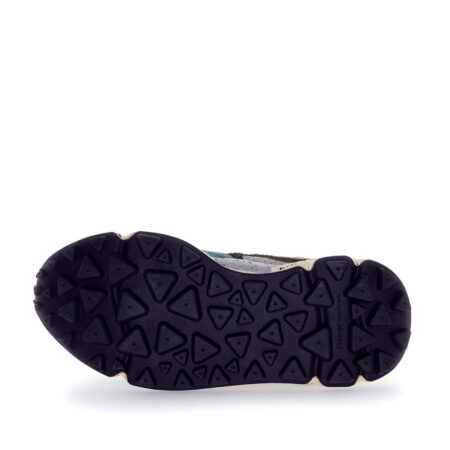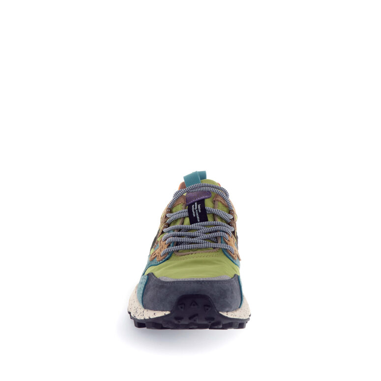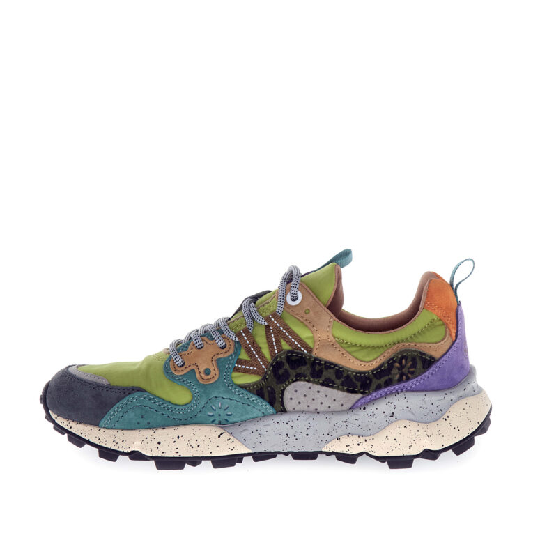 - Sneaker Flower Mountain modello Yamano in tessuto tecnico verde con riporti in suede grigio petrolio e cavallino maculato verde e nero.