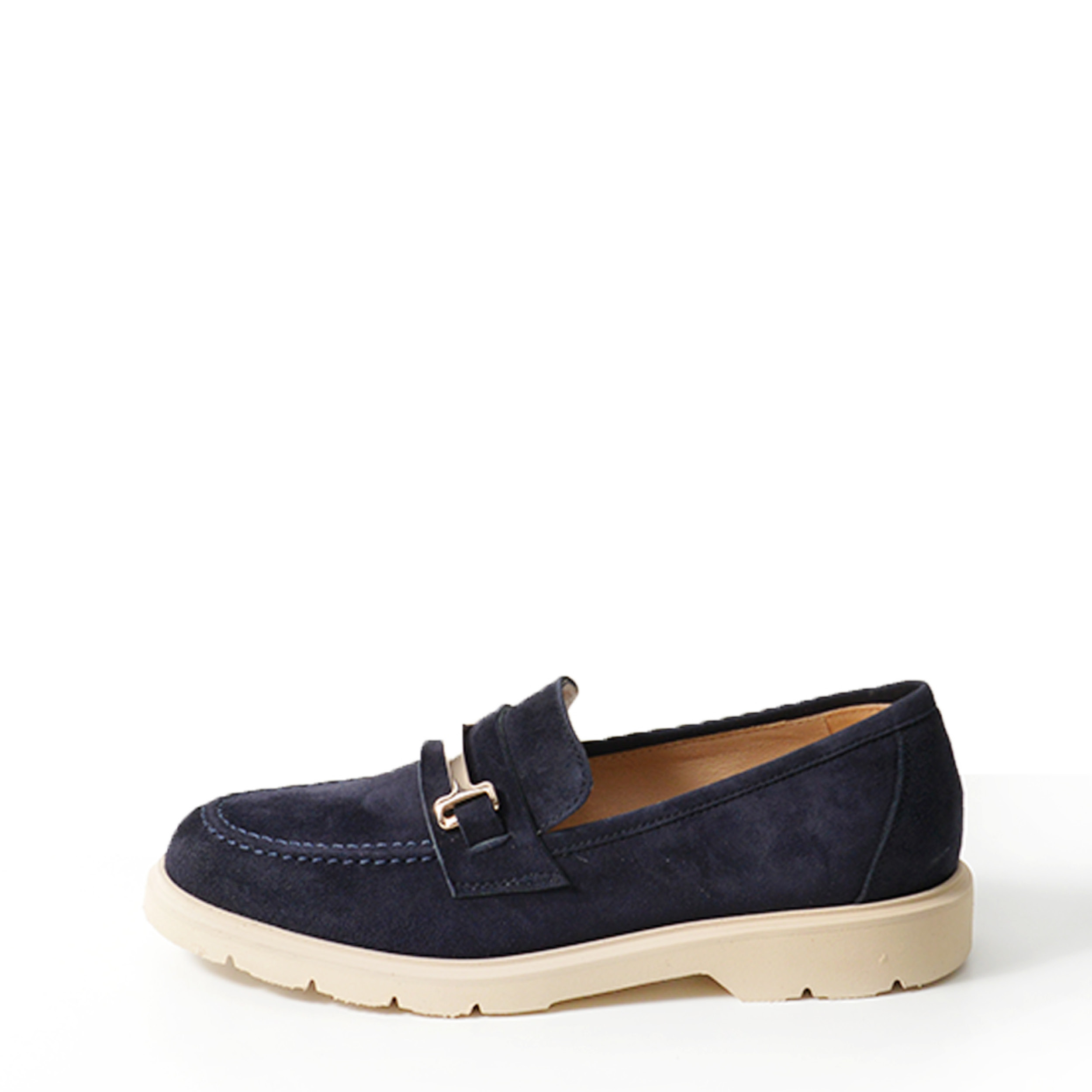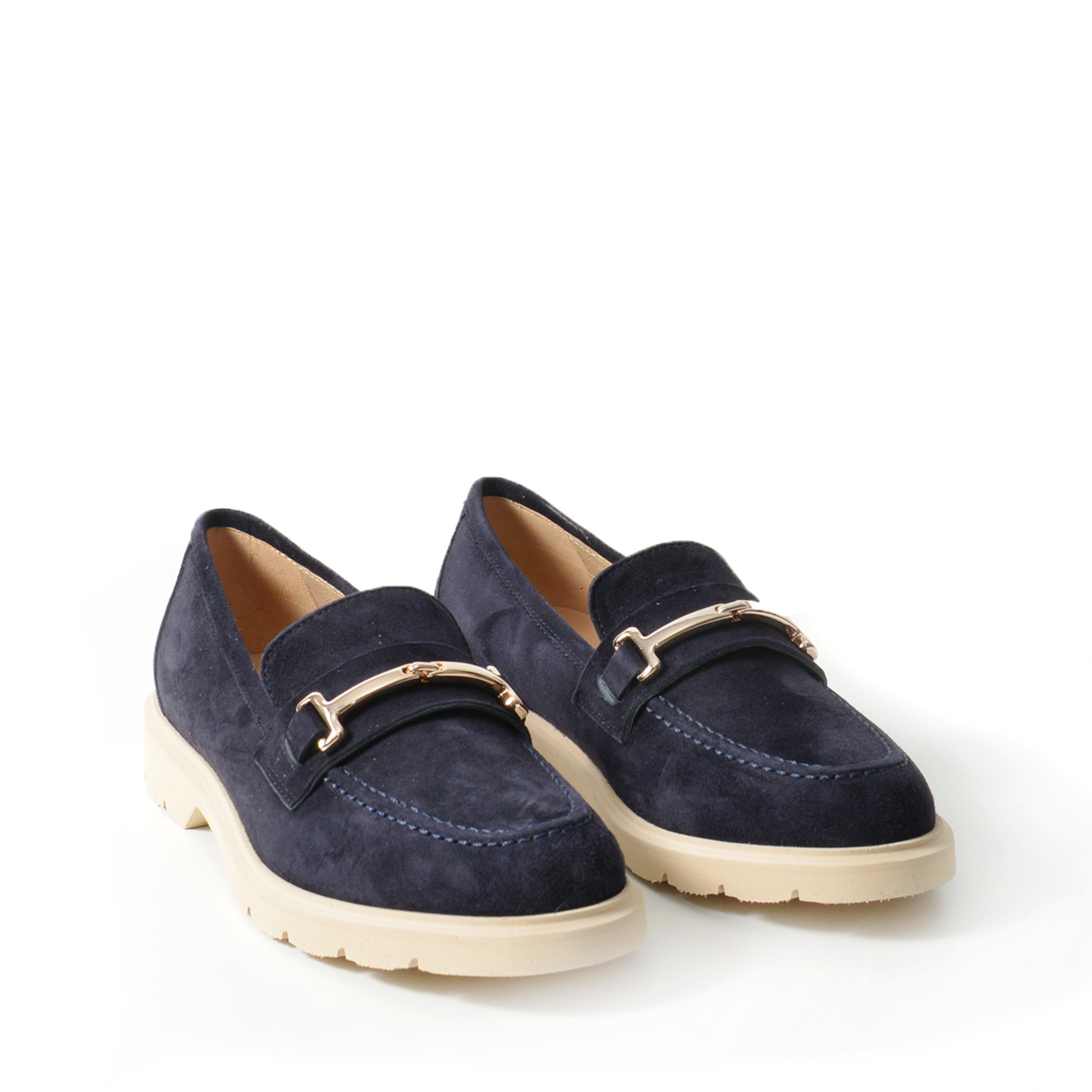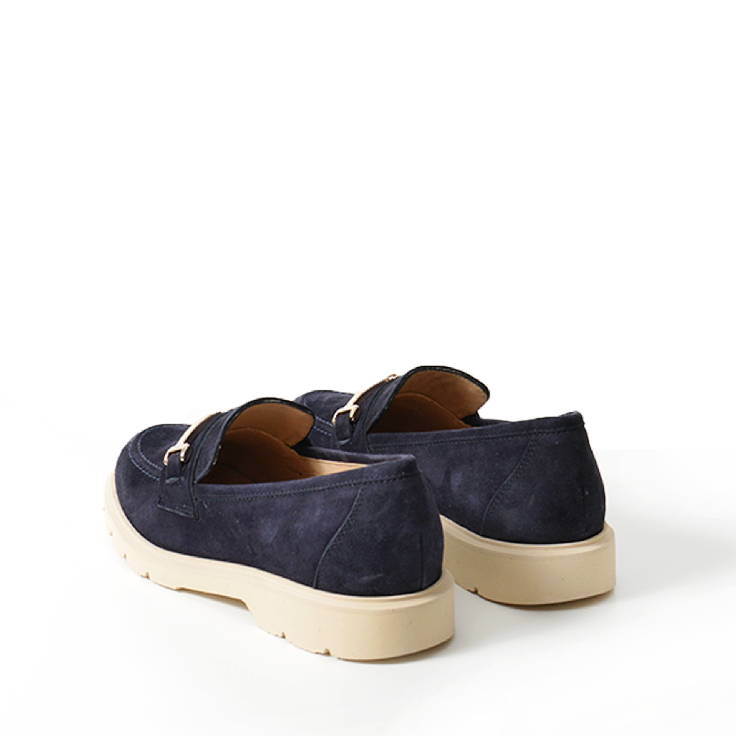 Mocassino in suede blu con accessorioro e fondo in gomma microporosa chiara.