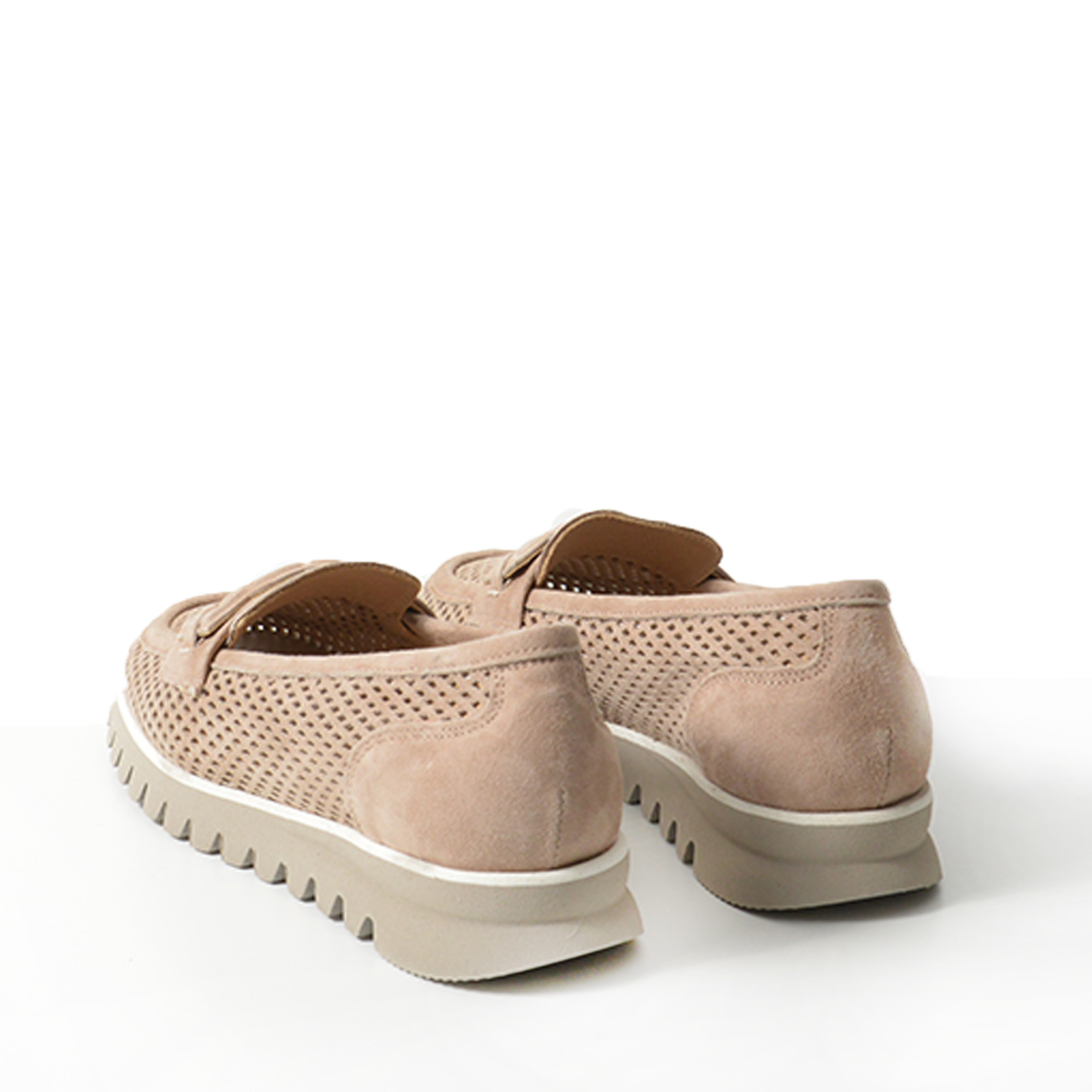 Mocassino in suede traforata biscotto con accessorio in tinta e suola in gomma ultralight.
