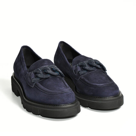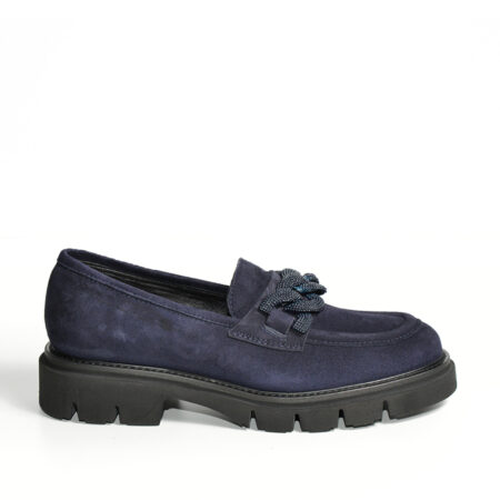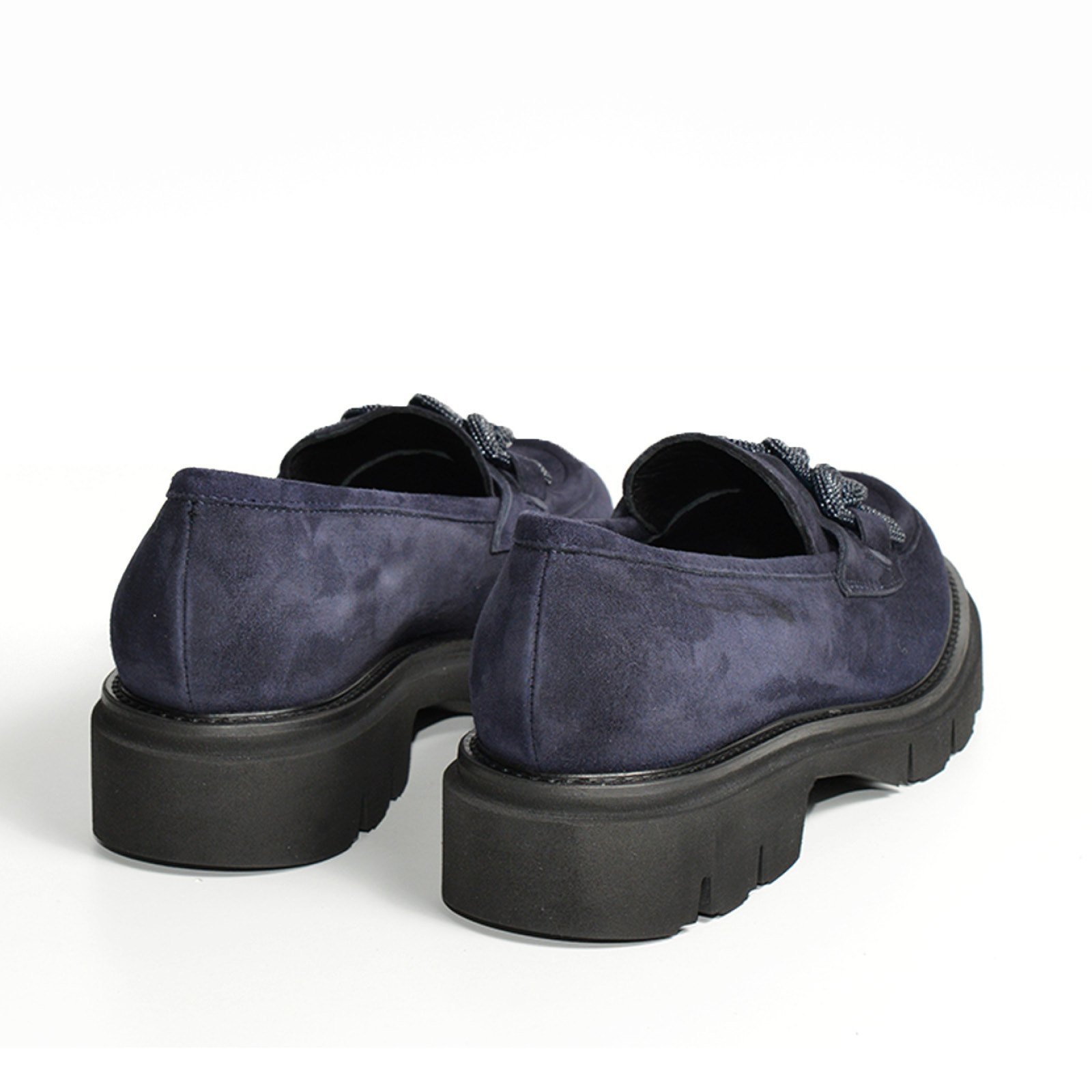 - Mocassino in morbida pelle scamosciata blu con accessorio.