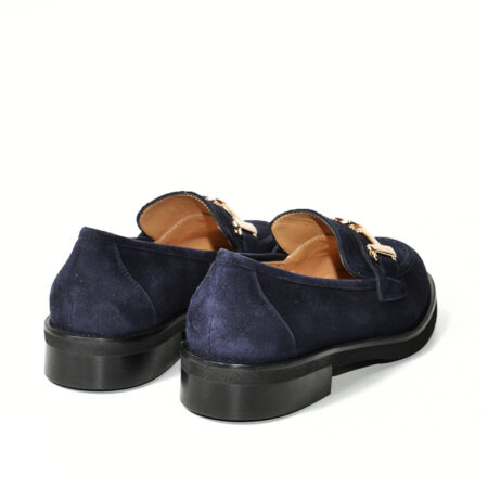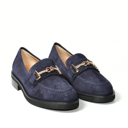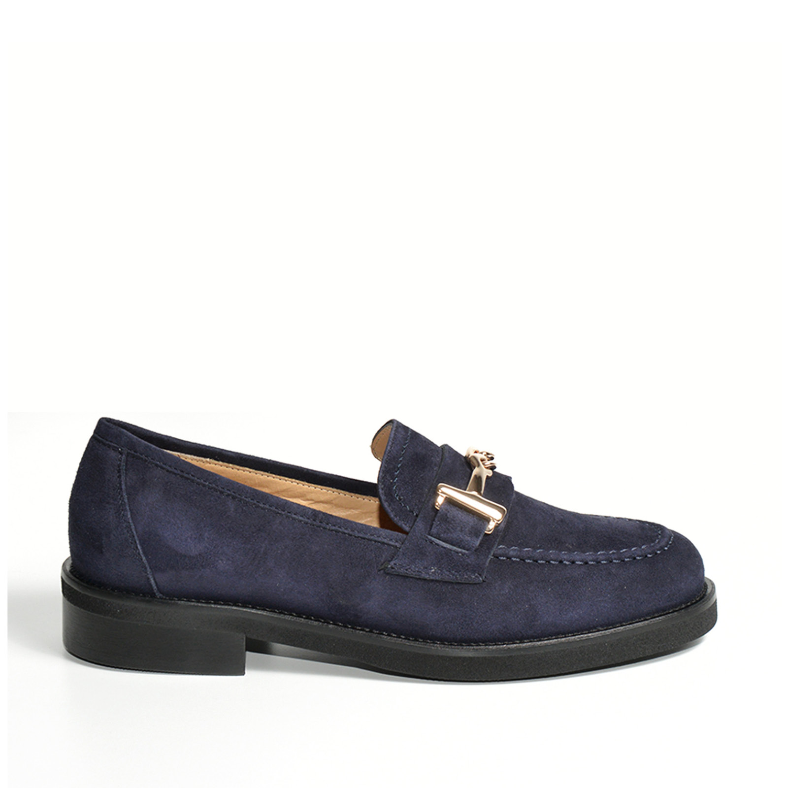 - Mocassino in morbida pelle scamosciata blu con morsetto dorato.