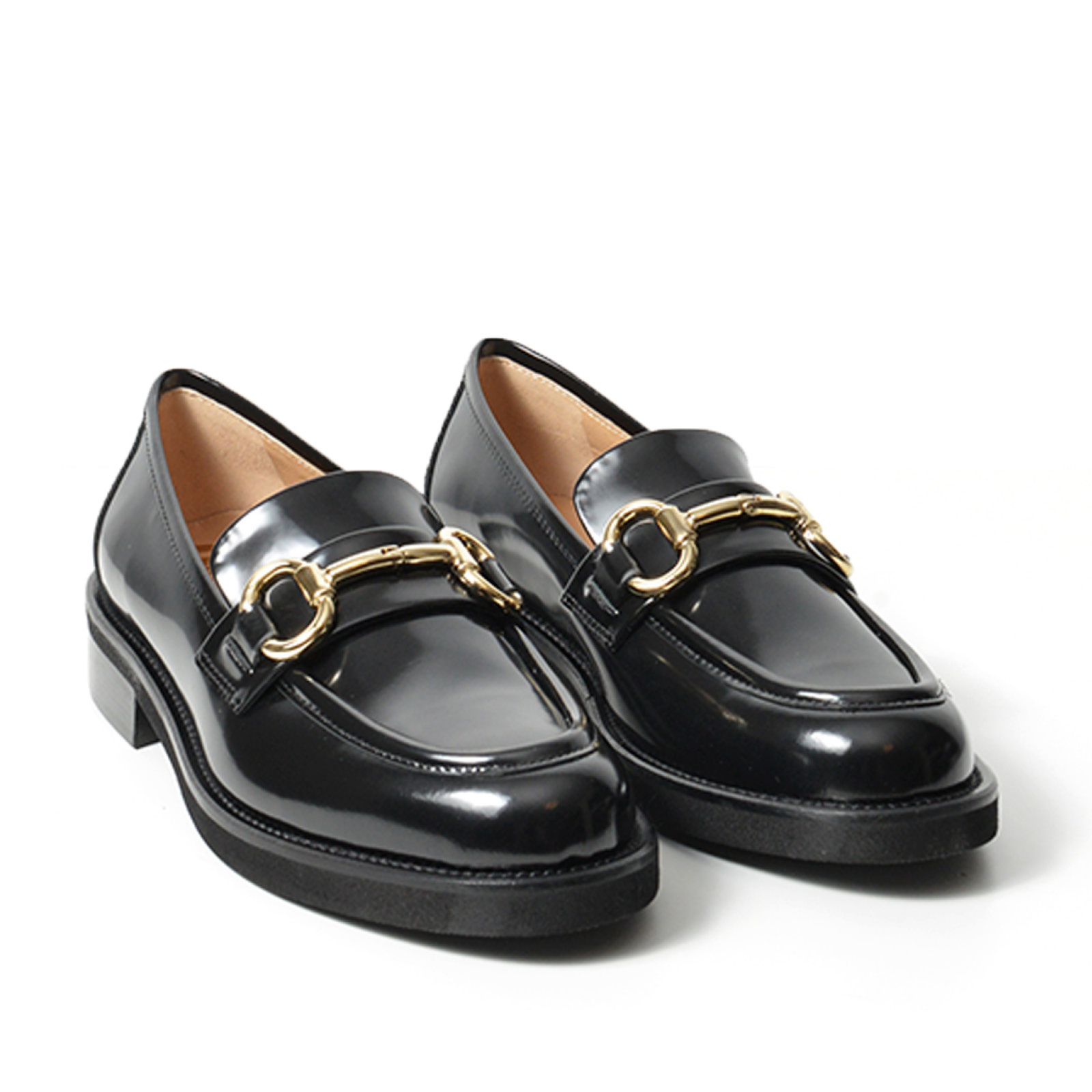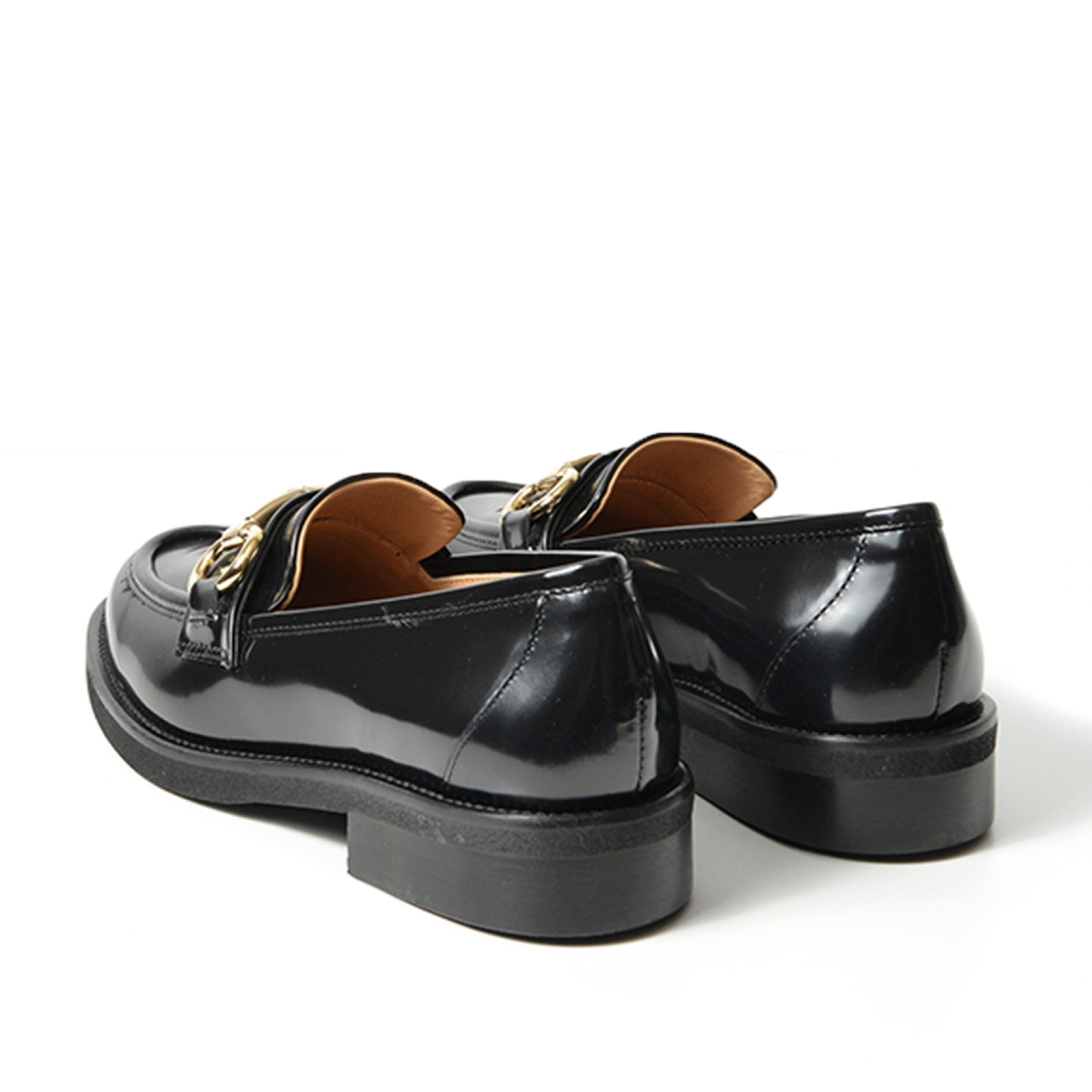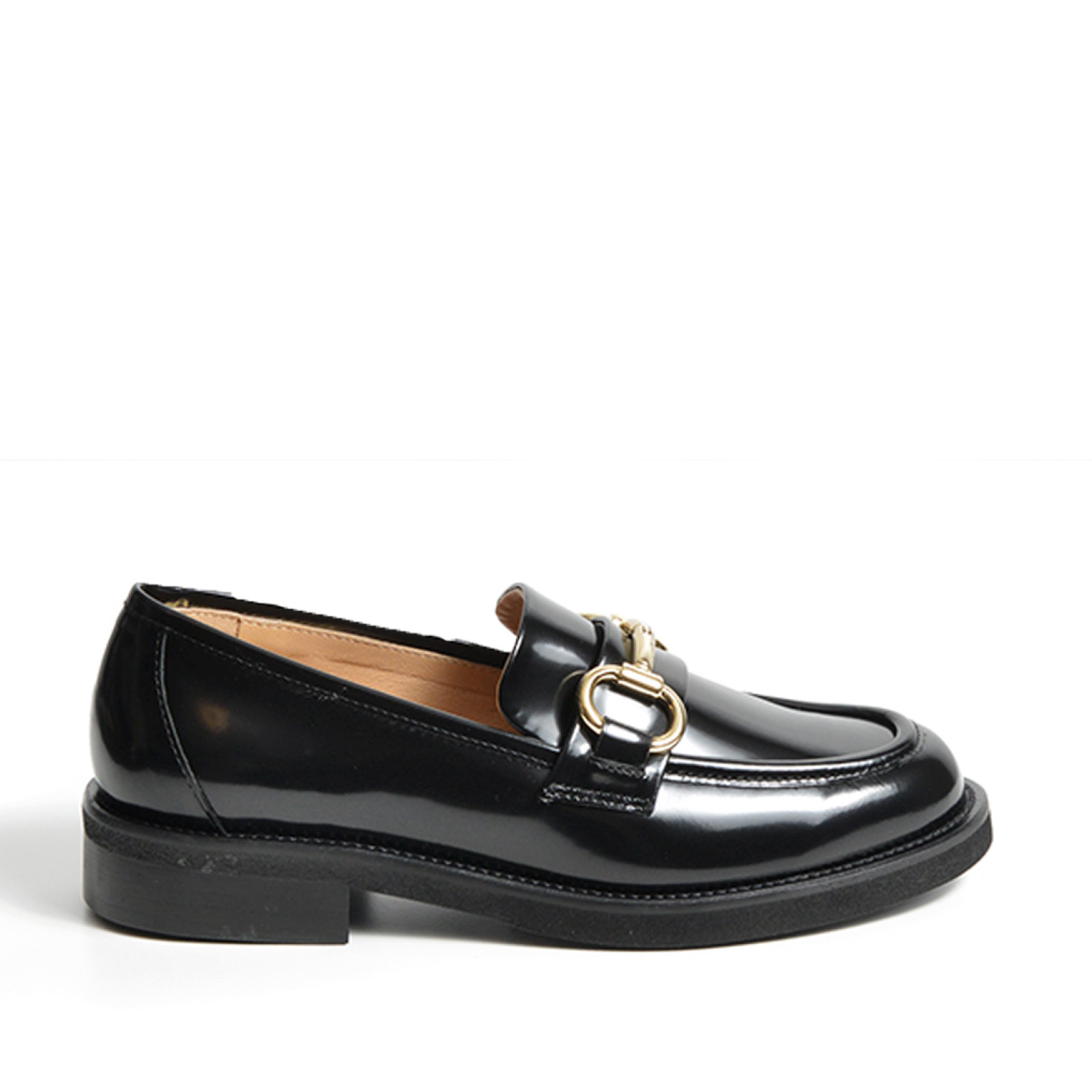 - Mocassino in morbida pelle di vitello spazzolata nera con morsetto a staffetta dorato.