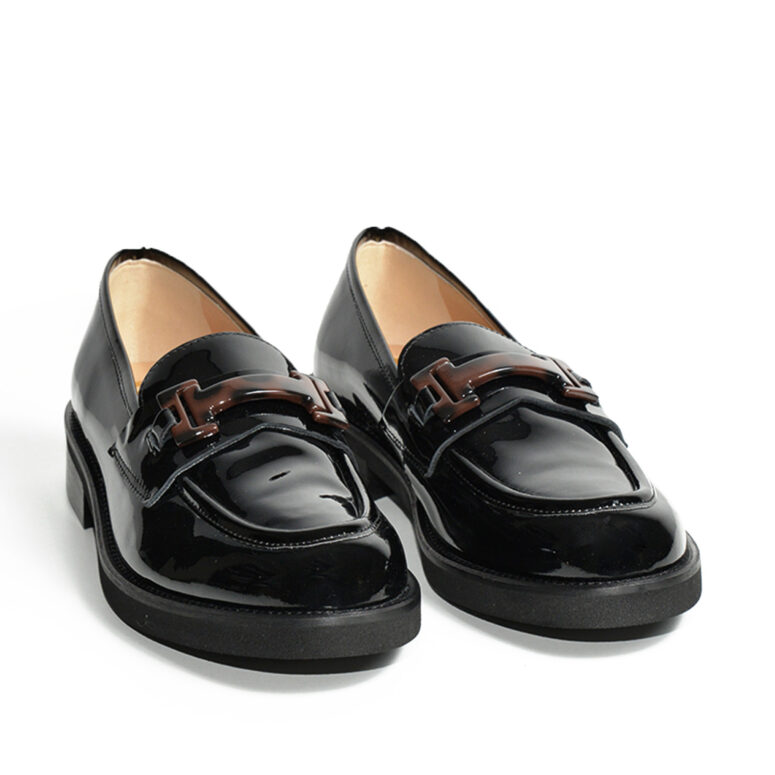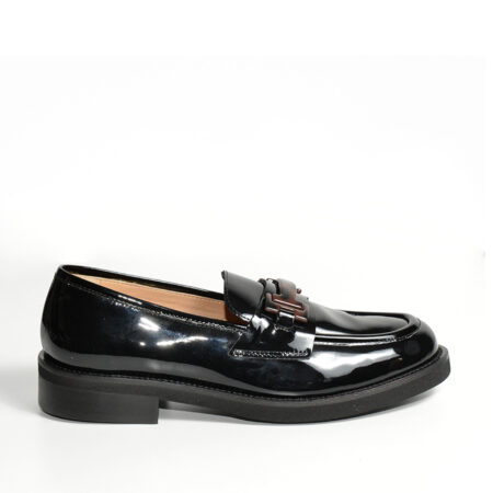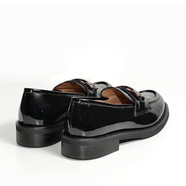 - Mocassino in morbida pelle di vitello vernice nero con accessorio lucido maculato nero.