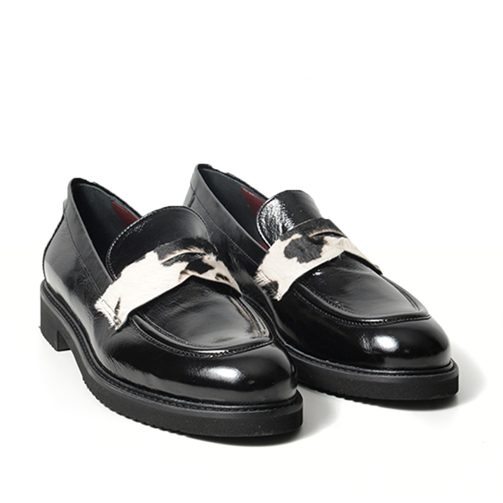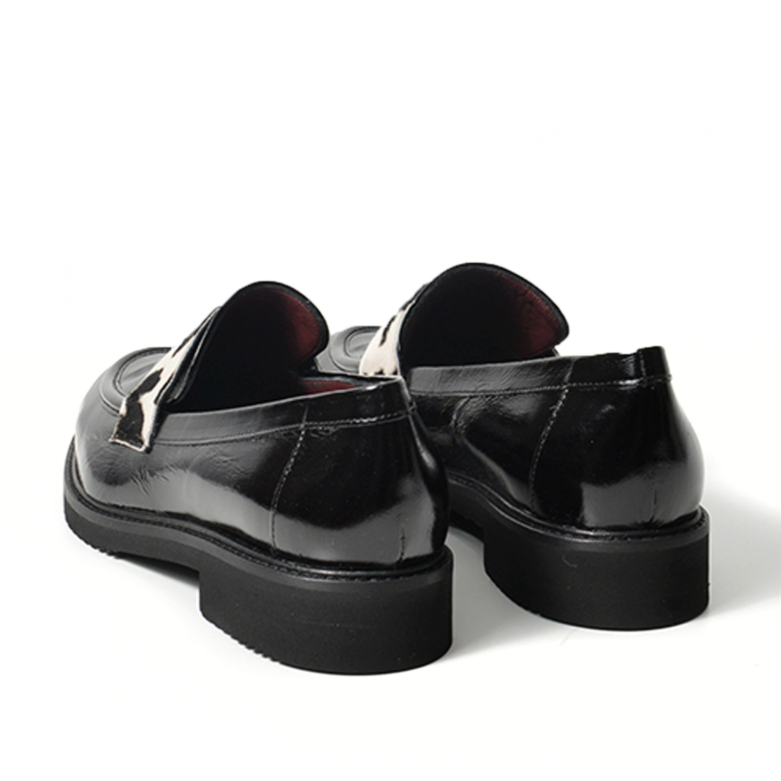 - Mocassino in vernice naplak nero con mascherina in cavallino bianco nera.