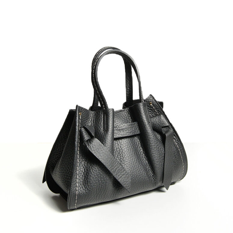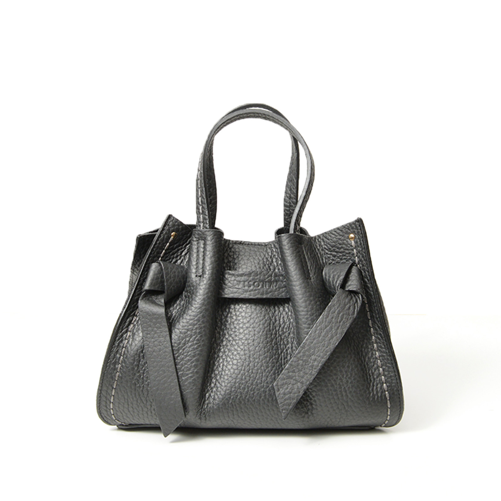 - Modello a bauletto con due manici in morbida pelle a grana grossa nera.