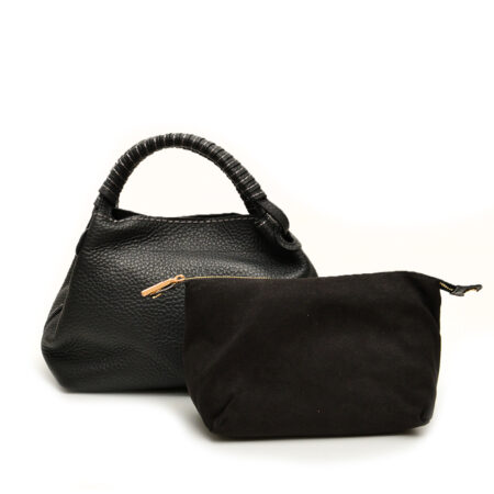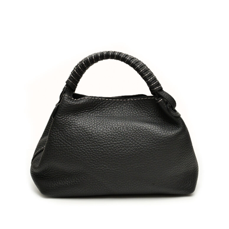 - Modello a bauletto con due manici in pelle martellata nera con impunture grigie.