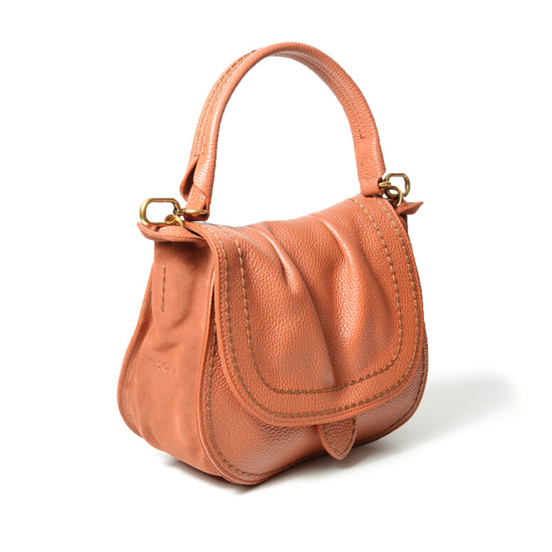 - Borsa Plinio Visonà modello a sella in morbida pelle martellata e suede color coccio con pattina arricciata.