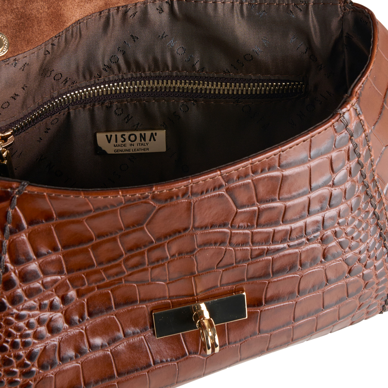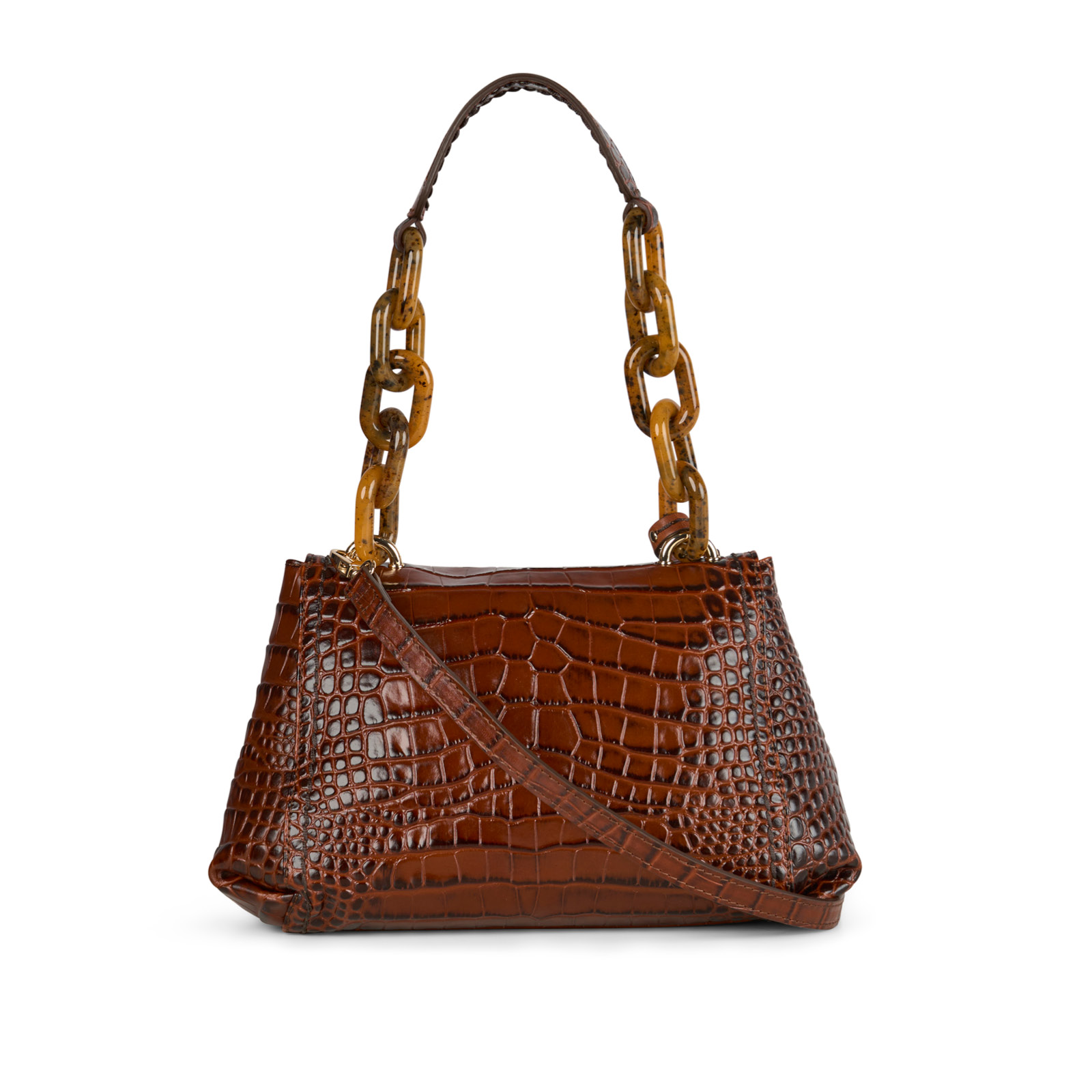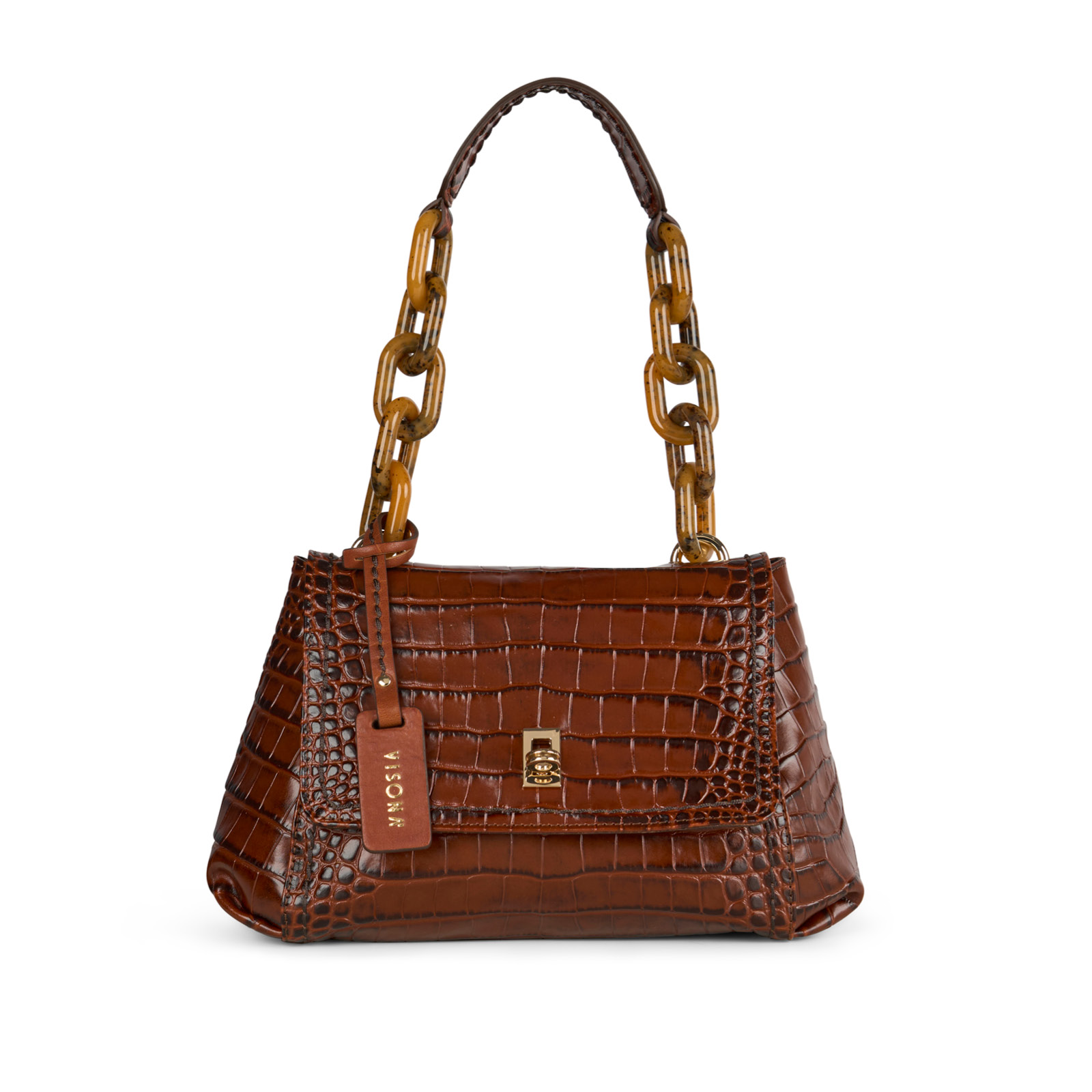 - Borsa Plinio Visonà modello Miami con monospalla con catena è realizzata in pelle stampa cocco brandy.
