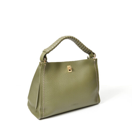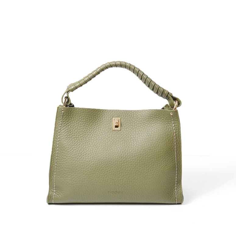 - Borsa Plinio Visonà monospalla in pelle martellata muschio con chiusura a gancio.