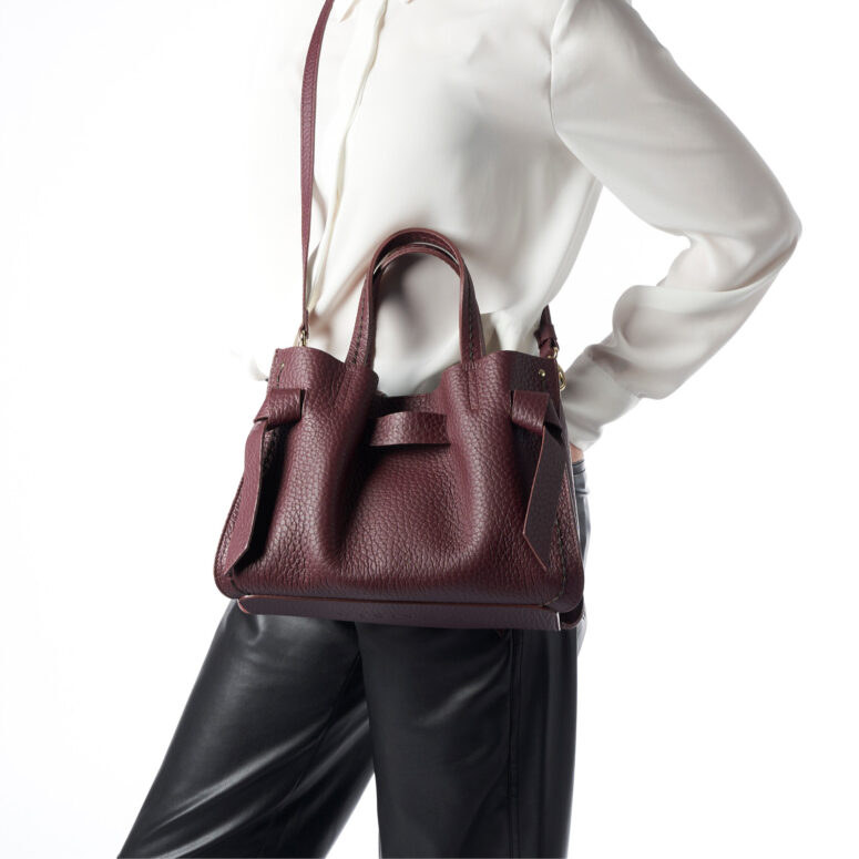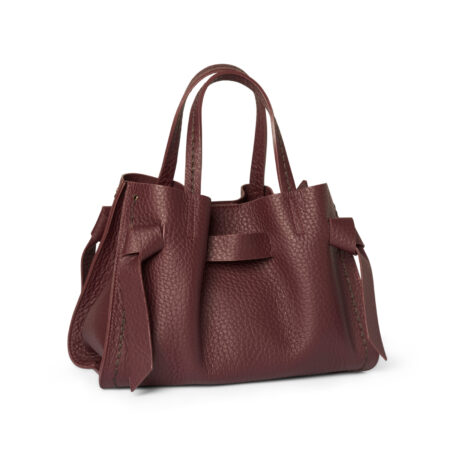 - Modello a bauletto con due manici in morbida pelle a grana grossa bordeaux.