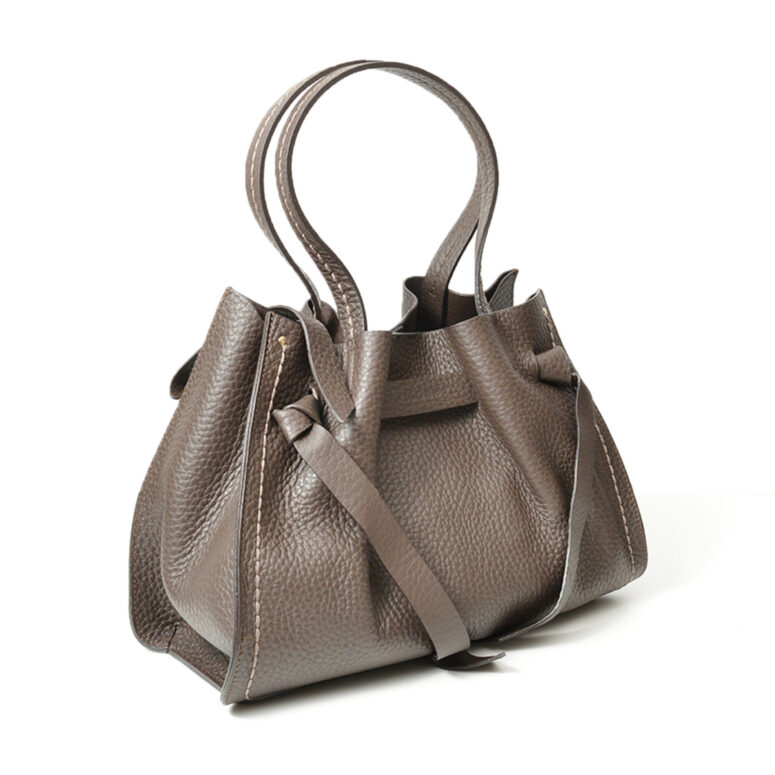 - Realizzata in morbida pelle a grana grossa moro con due manici per portarla a spalla.