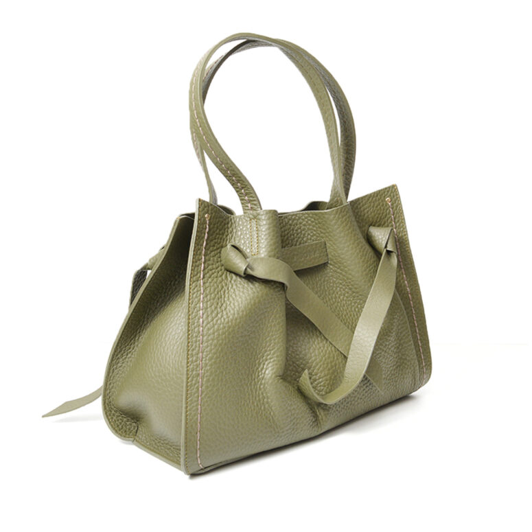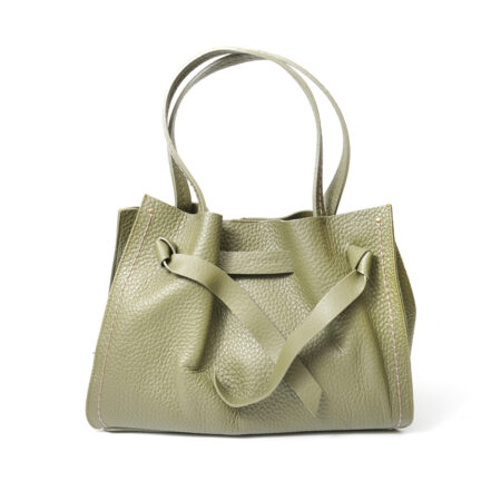 - Realizzata in morbida pelle a grana grossa verde con due manici per portarla a spalla.