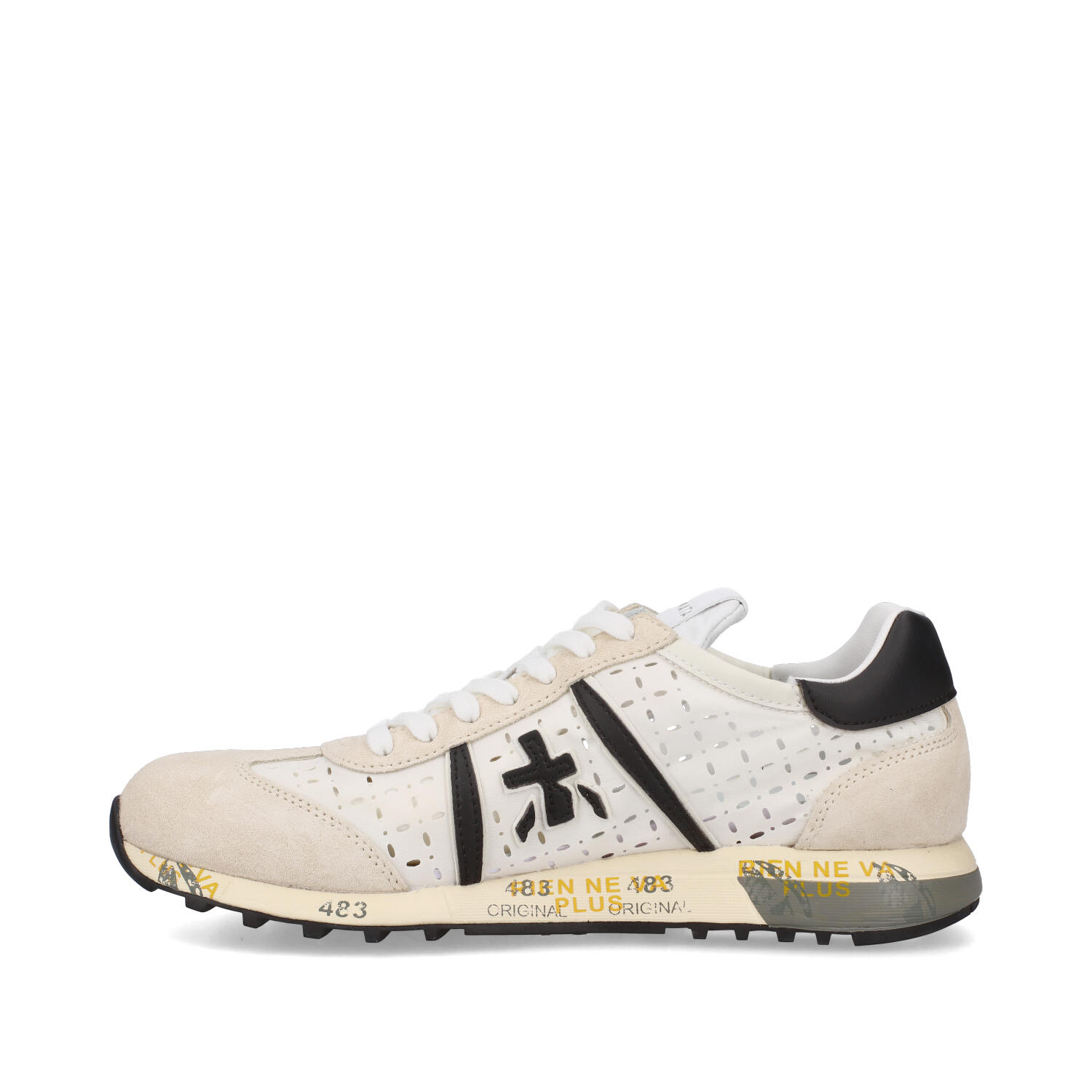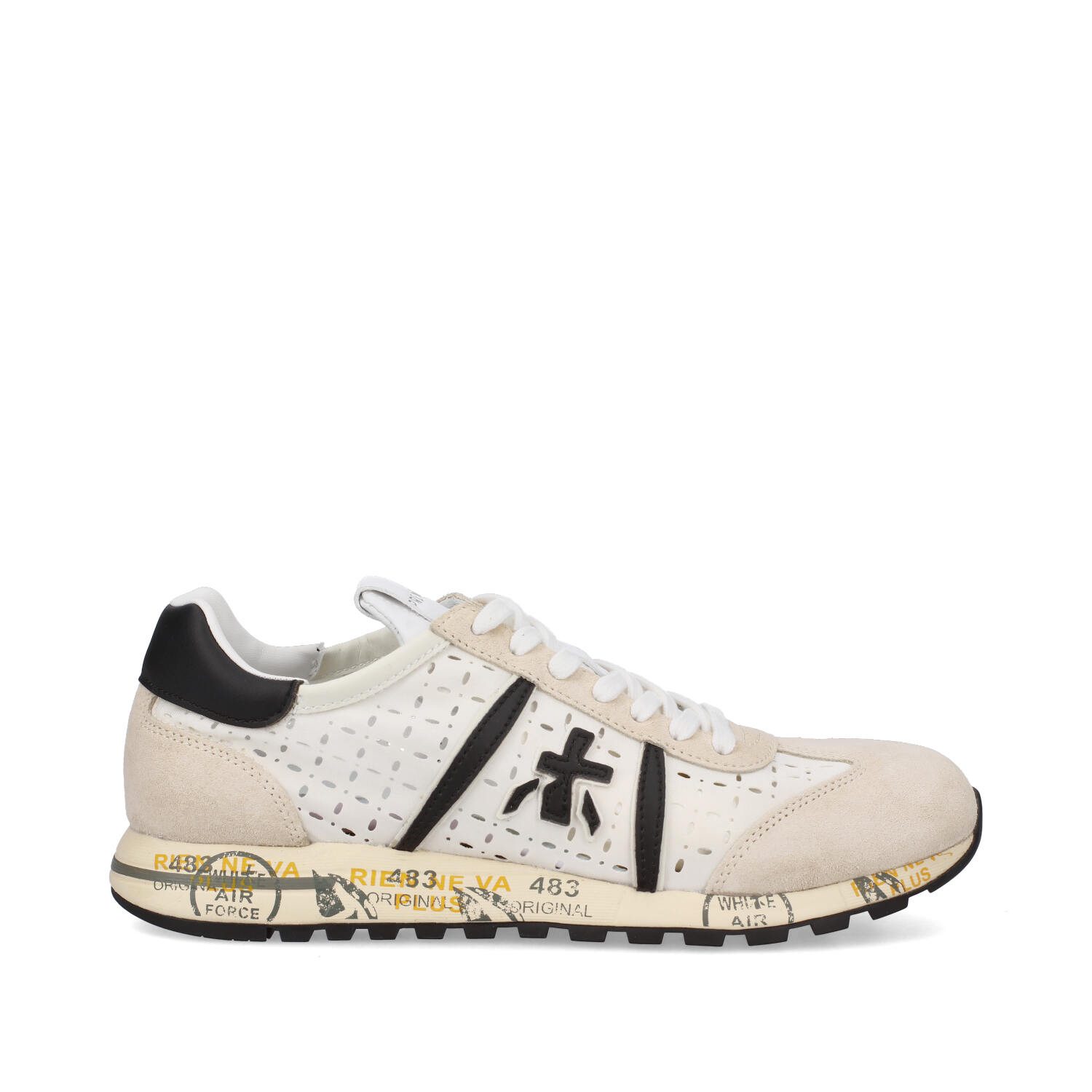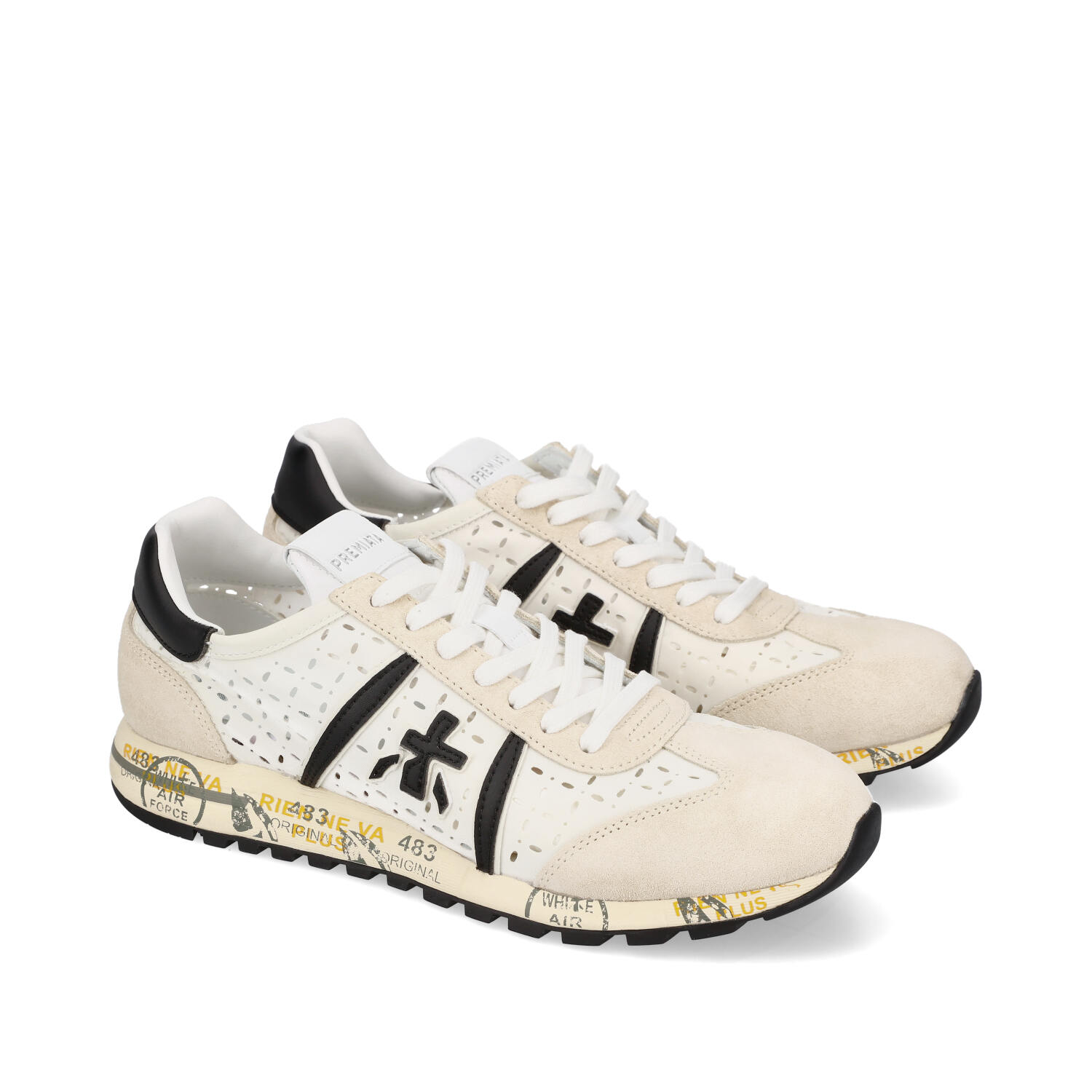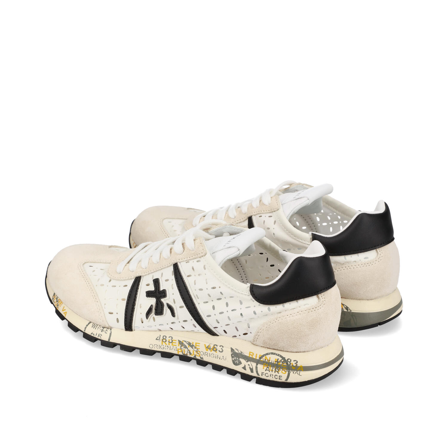 - Icona del marchio è realizzata in leggero tessuto tecnico traforato bianco con particolari in suede e logo e topponcino in pelle nera a contrasto.
