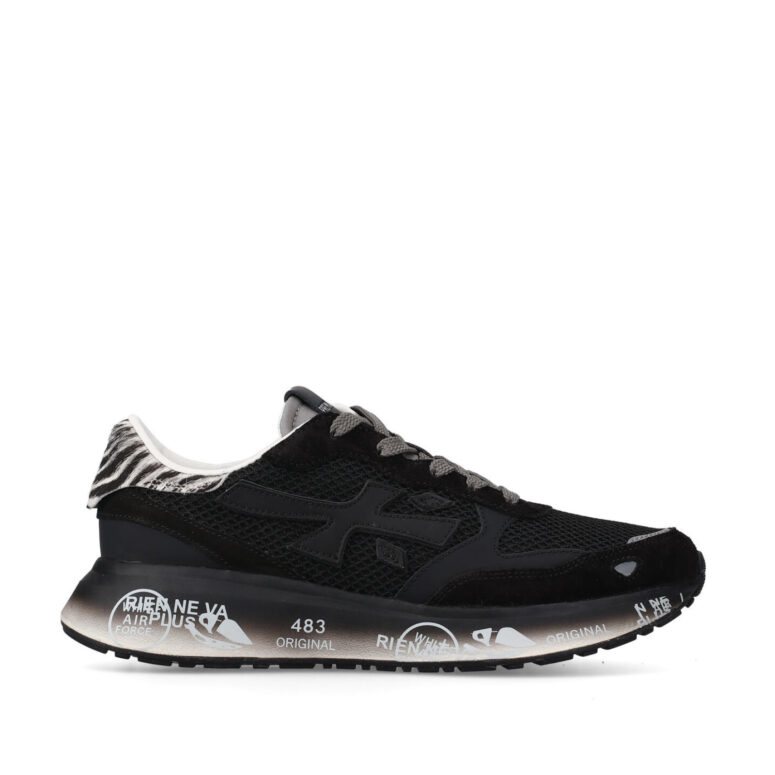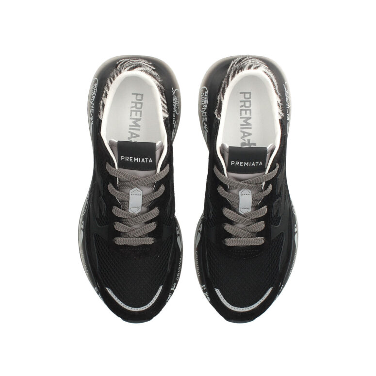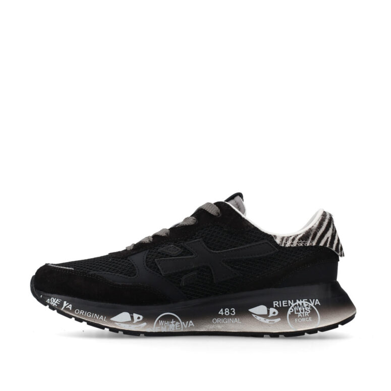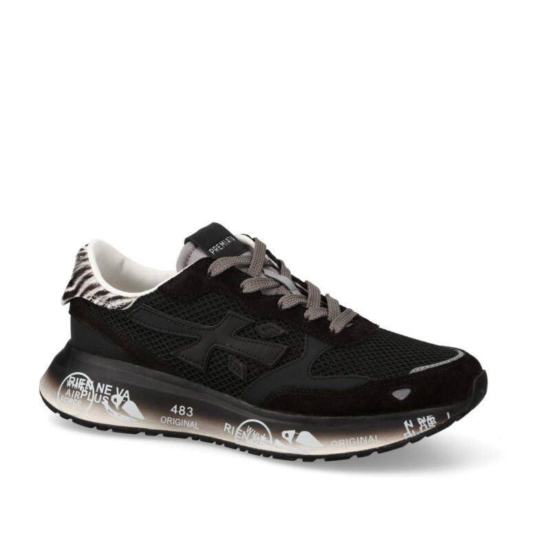 - Look tipo retro running in suede e tessuto tecnico nero ha lacci grigi e top in cavallino zebrato bianco nero.