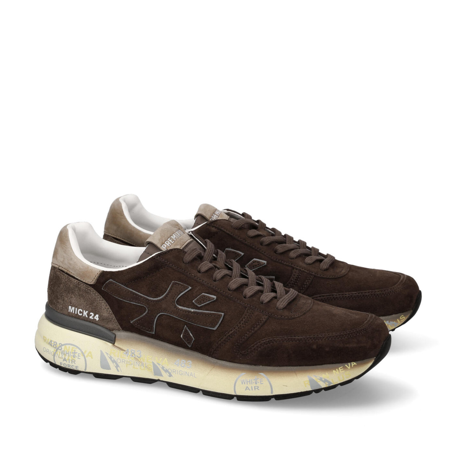- Sneaker Premiata uomo modello Mick realizzata in pelle scamosciata marrone con topponcino posteriore taupe.