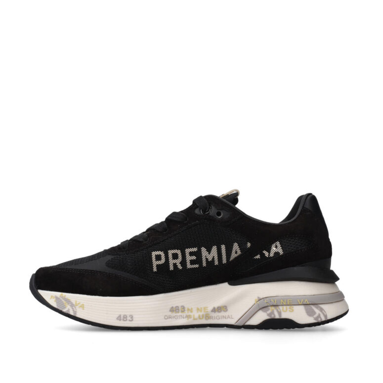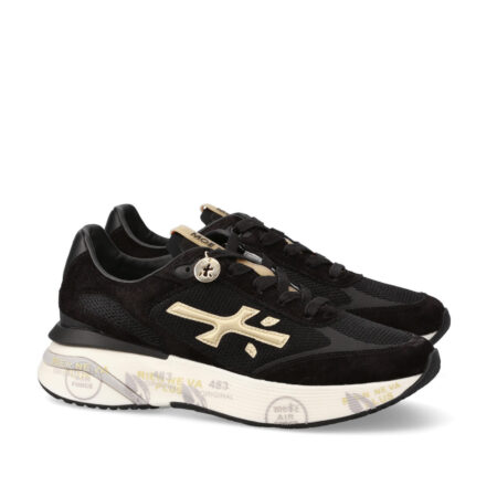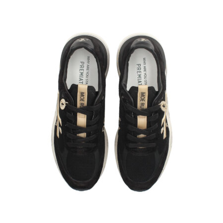 - Sneaker Premiata modello Moerund in suede e tessuto tecnico nero con particolari del logo in oro.