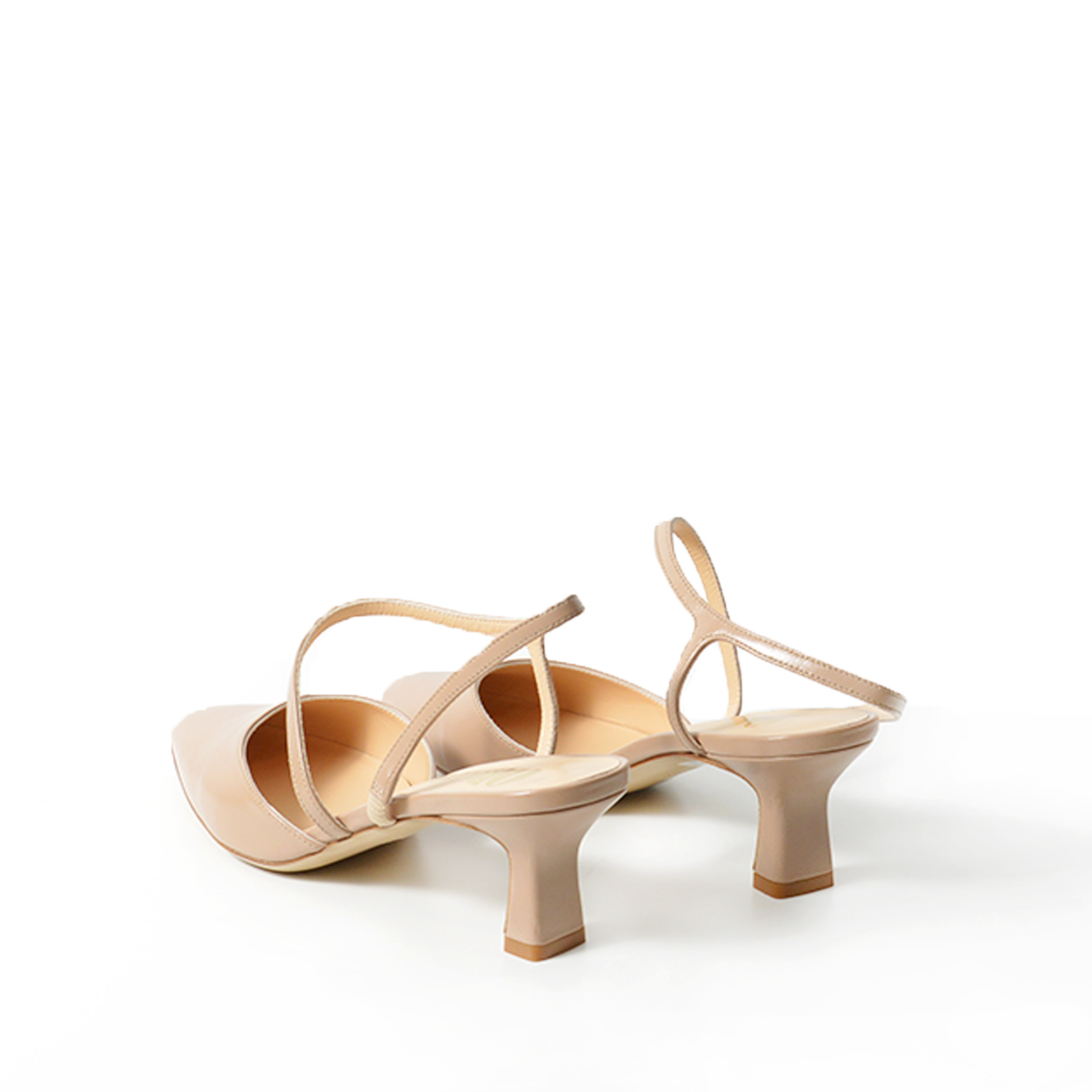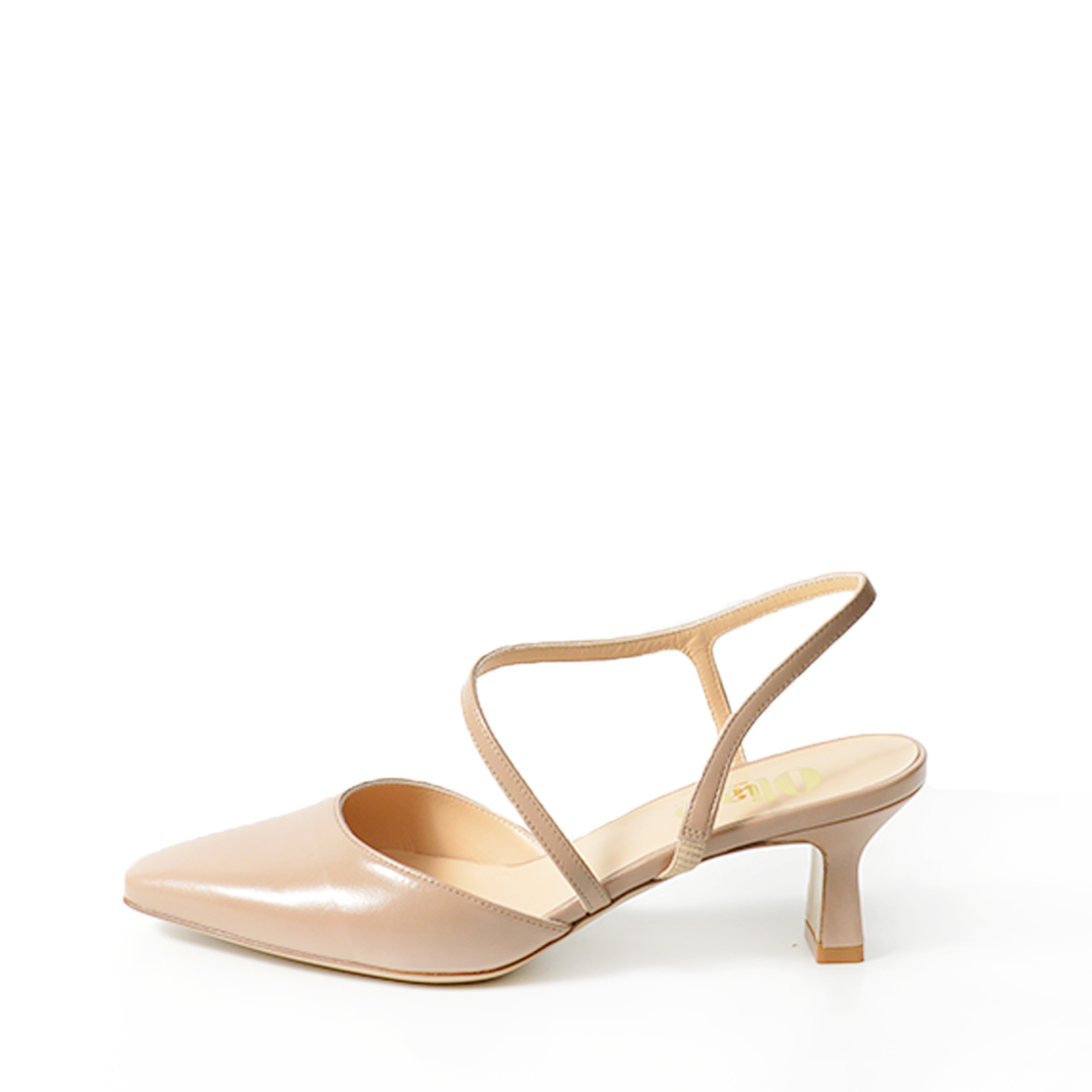 Slingback in morbida nappa beige con cinturino diagonale sul collo del piede.