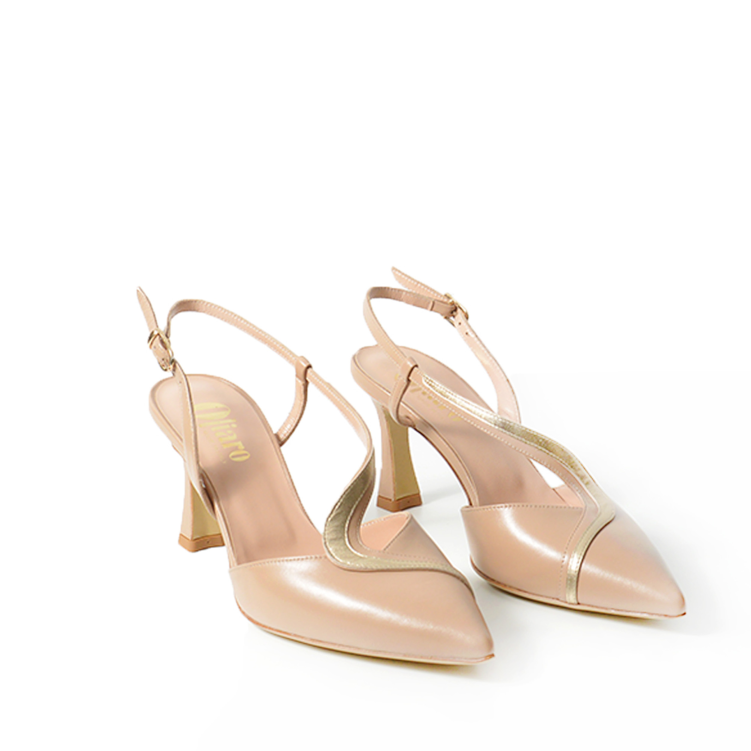 Slingback in nappa beige con listino diagonale sul collo del piede con particolare in nappa lux oro.