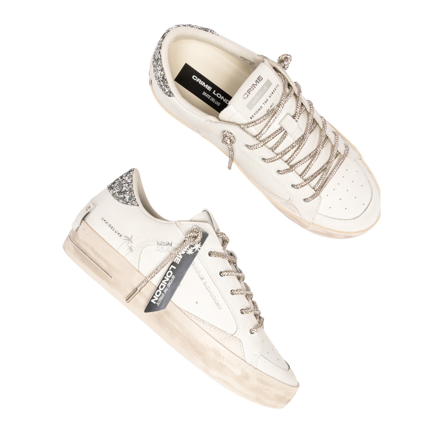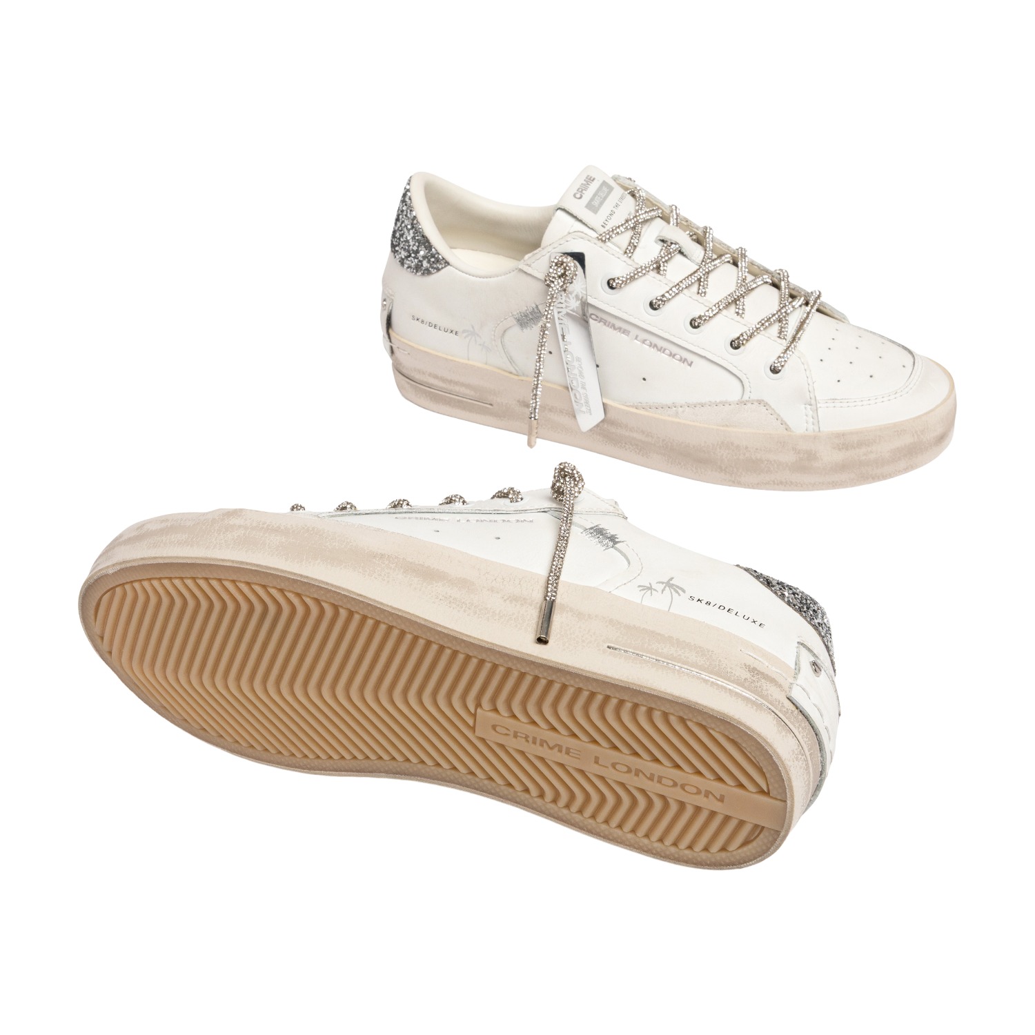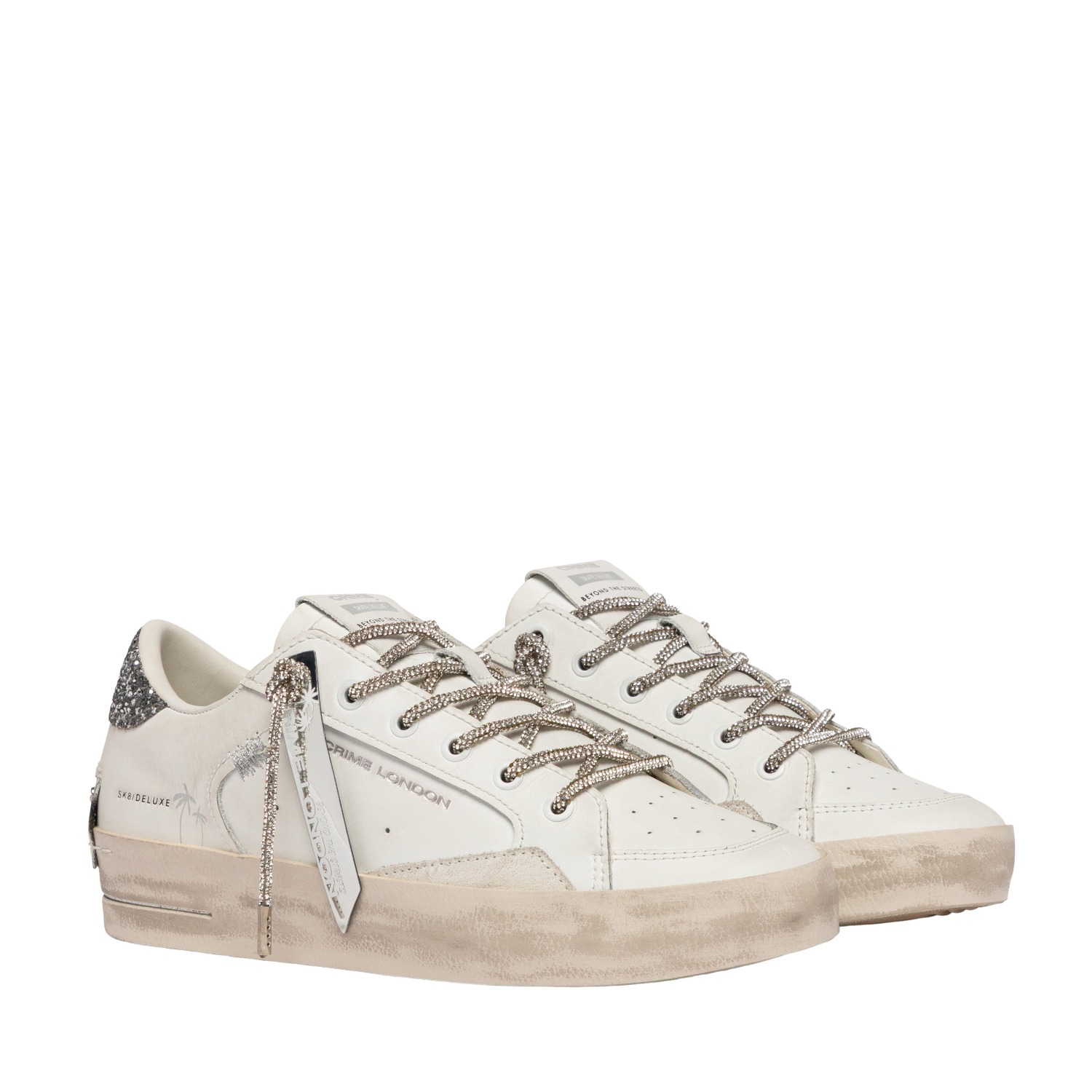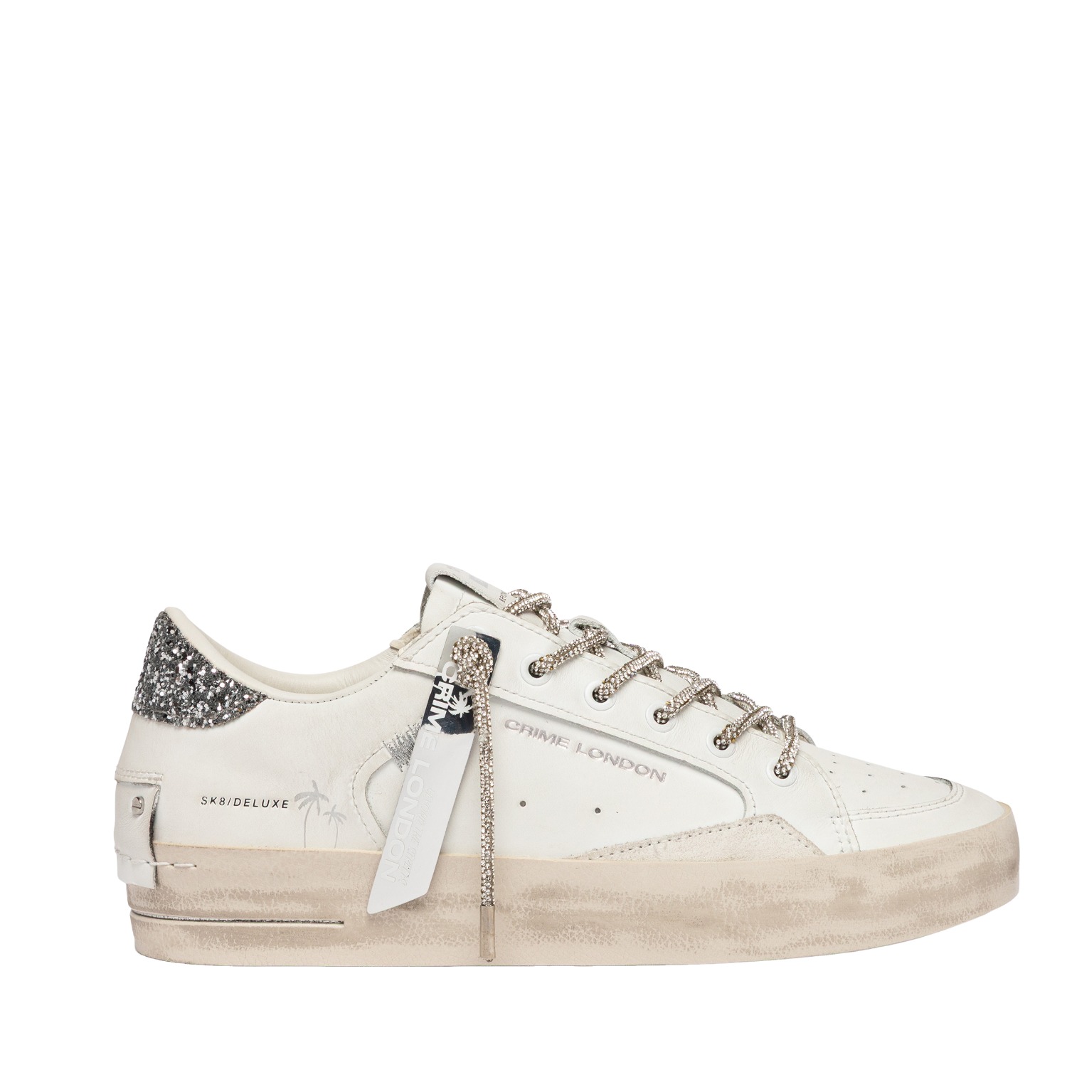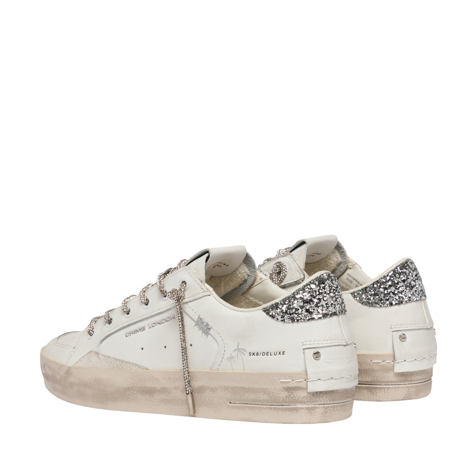 Sneaker Crime London donna modello SK8 Deluxe in morbida pelle bianca topponcino in glitter argento.
