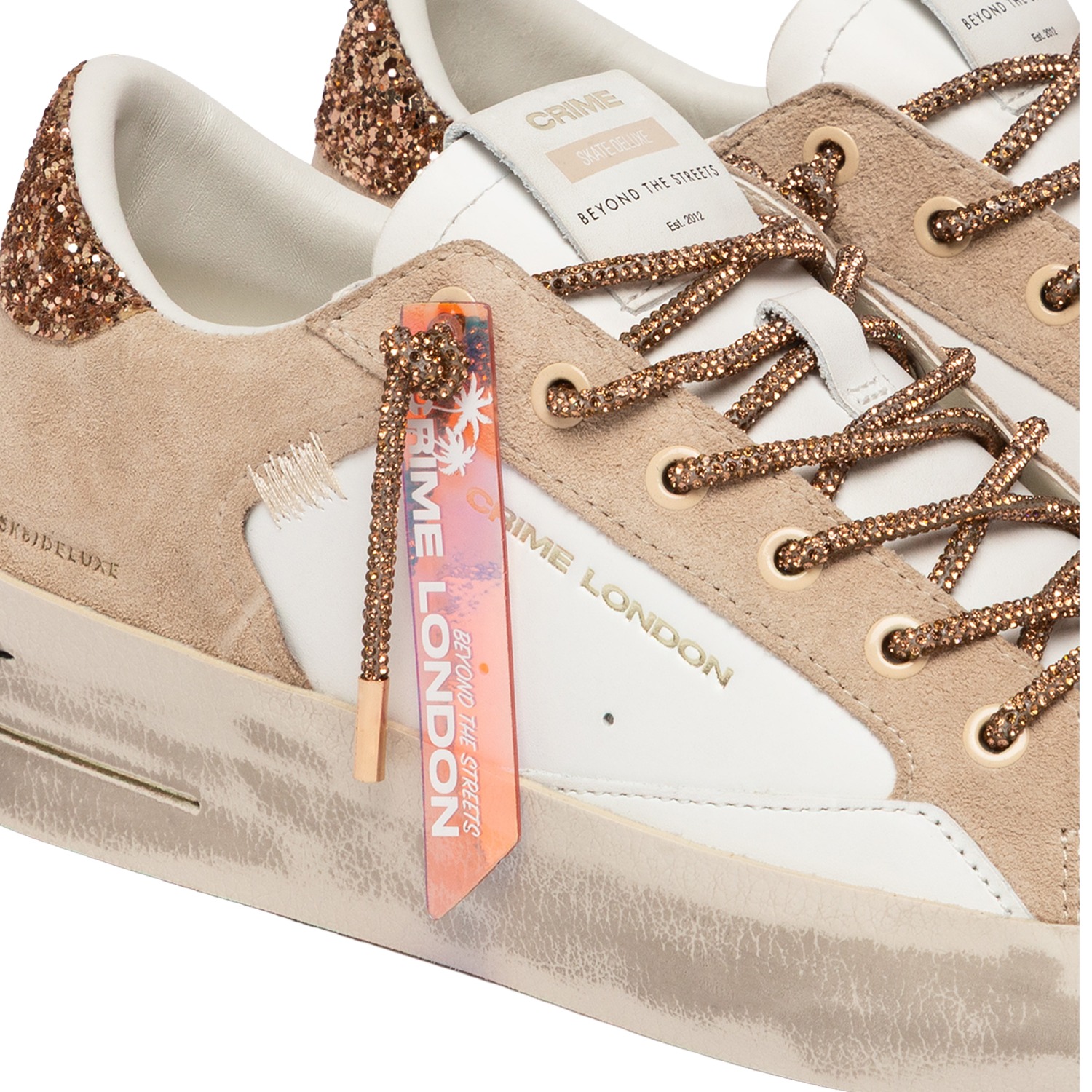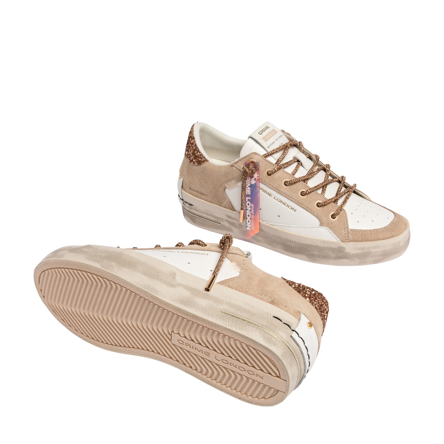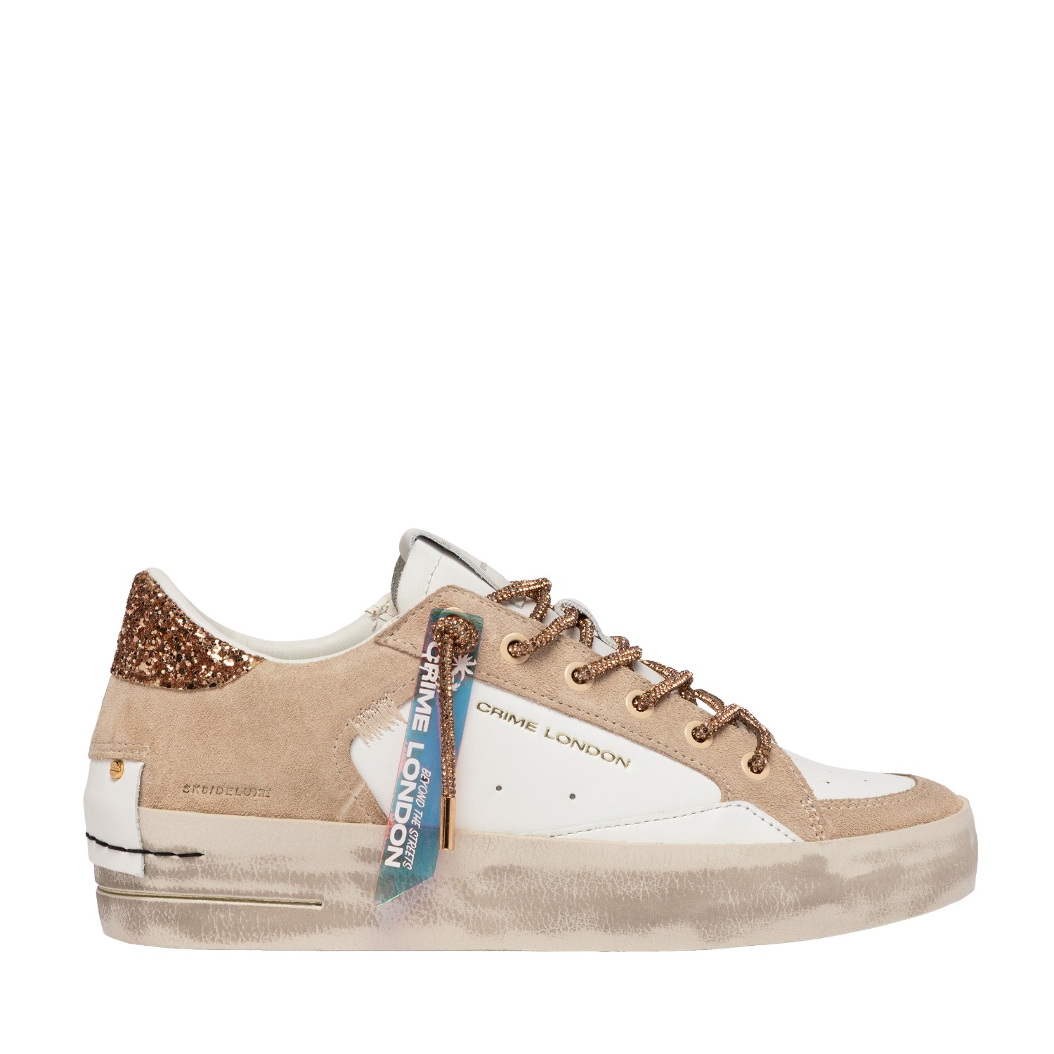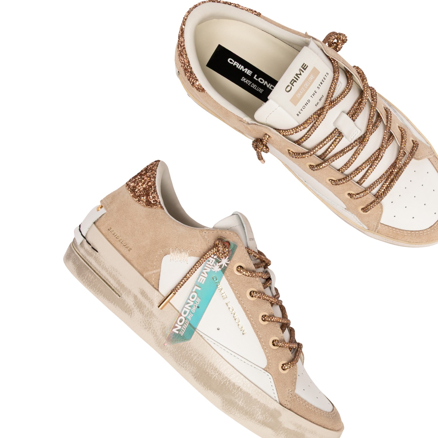 Sneaker Crime London SK8 Deluxe in pelle bianca e suede taupe e glitter oro.
