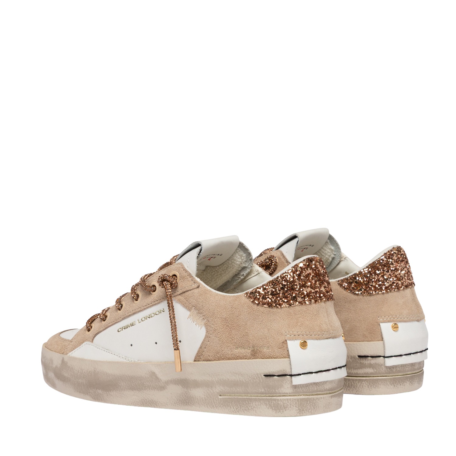 Sneaker Crime London donna modello SK8 Deluxe in morbida pelle bianca e suede taupe topponcino in glitter oro.